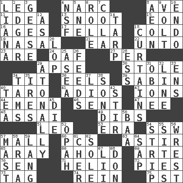 ACROSS 1. Part of a journey 4. Drug cop 8. "___ Maria" 11. The main thing one is thinking about 13. Snob 15. Period of immesurable duration 16. Matures 17. Man or boy (slang) 18. Lacking warmth 19. Rhinal 21. Ewer handle 22. To (old English) 23. "We ___ not amused" (Victoria) 24. Clumsy lout 27. For each 29. Domed church section 30. Fur scarf 34. Teat (slang) 36. Snakelike fish 39. Unit of acoustic absorption 40. Edible starchy tuberous root 41. Goodbye (Sp.) 43. Charged atoms 44. Make improvements or corrections to 46. Posted 47. Born 48. Slender Brazilian palm 49. Claim 51. Lion 53. Period 54. Compass dir. 57. Promenade 60. Personal Computers (abbr.) 63. Being in motion 65. Like ___ of sunshine 66. Hold, grip (Informal) 69. Johnson of "Laugh-In" 70. Elected rep. 71. Sun: prefix 72. Sliced desserts 73. Label 74. It's straight from the horse's mouth 75. Pacific Standard Time (abbr.) DOWN 1. Woody, climbing, usually tropical plant 2. _ Allan Poe 3. Honkers 4. Overdraft (abbr.) 5. One (Scot) 6. Hero or heavy, e.g. 7. Root beer relative 8. Period of immesurable duration 9. Electrical Unit 10. Inside; within (prefix) 12. White ___ sheet 14. Canvas cover 18. Window treatments 20. Trim (branches) 25. Toward the sea 26. Eats 28. Double-curved letter 29. Lacking a tonal center or key 31. Mitch Miller's instrument 32. Actor's bit 33. Followers of ems 34. Scottish caps 35. Angers 37. Whopper 38. Something which is sent 40. Beverage made from leaves 42. Agitate 45. Pass on 50. Sound made by sheep 52. Brightly colored fish 54. Remove all contents or possession from 55. Locates 56. Take or capture by force 57. Vertical spar for supporting sails 58. Type of rug 59. Austrian-born American filmmaker Fritz 61. "Mermaids" star 62. Not divided or shared with others 64. Plant excrement 67. Cards in a Roman deck? 68. Spanish title