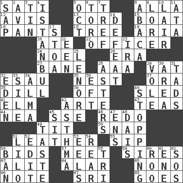 ACROSS 1. Suttee (variant) 5. Baseball player Mel 8. Silent film actress Nazimova 12. Advice 13. Drawstring 15. Water vessel 16. Leg coverings 18. Woody plant 19. Operatic vocal solo 20. Had dinner 22. Person of authority 24. Christmas carol 26. Period 27. Object of repulsion 28. Auto club (abbr.) 29. Large container 32. He sold his birthright 35. A home for chicks 37. Mouth or opening 38. Deli pickle 39. Often (poetically) 40. Downhill vehicle 41. Shade tree 42. Johnson of "Laugh-In" 43. Afternoon social gatherings 44. Teachers' org. 45. Compass dir. 46. Make new 49. Teat (slang) 50. Fastener 51. Cordwainer's material 55. Small drink 56. Auction offers 57. Rendezvous 59. Titles for men of rank and authority 63. Came down and settled, as after flight 64. Having or resembling wings 65. Words to Nanette 66. Observe 67. Indian title of respect (Mr.) 68. Travels DOWN 1. Plant excrement 2. Actress Gardner 3. Shallow baking pan 4. Byzantium, centuries later 5. Sep. follower 6. "Corrida" creature 7. Unclean, religiously 8. Phillipine bananalike plant 9. Old wives' tales, e.g. 10. Den 11. "One Day ___ Time" 14. Outscore 17. Portico 21. Car or cant ending 23. Retirement account (abbr.) 25. Poe poem 28. Michaelmas daisies 29. Grand slam 30. Length times width 31. Bits 32. Locale of original sin 33. Drop; flow; fall 34. _ mater 36. Lizard (obsolete) 40. Constricting 42. Respiratory problem 45. Be seated 47. Followers of ems 48. Raised platform 49. Clothes sense 51. _ and Stitch 52. Prepare for publication 53. Snakelike fish 54. Located in or toward the back 56. Bar 58. Three (prefix) 60. Friend of Pooh 61. Compass dir. 62. Mayday