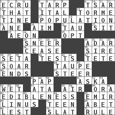 ACROSS 1. Shade of tan 5. Canvas cover 9. Russian ruler of old 13. Not this but _ 14. Slanted text style (abbr.) 15. Singer Mel 16. Prong on a fork 17. Census information 19. A saturated hydrocarbon 20. Direct toward a target or goal 21. The 19th letter of the Greek alphabet 22. Be seated 23. A really long time 25. Choose 26. Contemptuous expression 30. The sixth month of the Jewish calendar 34. Stop 35. Male parent of an animal 36. Stalk of a moss capsule 39. Trials 42. Wig 43. Fly high 44. Grayish beige 46. Conclusions 47. Navigate 48. Infant food 51. "____ silly question..." 54. Soggy 57. "One Day ___ Time" 58. Wind 60. Mouth or opening 62. The property of being fit to eat 65. Independent ruler or chieftain 66. "_ and Lucy" (Charlie Brown theme song) 67. Adolescent 68. Collude with 69. For fear that 70. Narrow board 71. Court order DOWN 1. Singer James 2. Large country 3. The wife of a rajah (variant) 4. Shoshoni 5. Native american tent (variation) 6. Smallest unit of an element 7. Hit sharply and swiftly 8. Mickey's pet 9. Small child 10. Indian titles of respect 11. Mine, in Marseilles 12. Monthly bill 15. Drawn tight 18. Infant locale 20. Queen of England 1702-14 24. Motion picture awards 27. Consume 28. Compass dir. 29. Musical pauses 30. Michaelmas daisies 31. Pass on 32. Nonscientific branch of learning 33. To sift 36. Compass dir. 37. A really long time 38. Small amount or degree 40. Make lace 41. Institute legal proceedings 45. Lightbulb-shaped fruit 48. Friends 49. Had dinner 50. Leg coverings 52. Dried seaweed eaten as food 53. Satellite of Uranus 54. Not ill 55. Singer Brickell 56. Airtight sealed metal containers 58. Toward the sea 59. Is not 61. Johnson of "Laugh-In" 63. With the exception that 64. Snakelike fish 65. Hearing organ