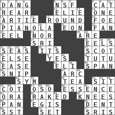 ACROSS 1. Mild oath, euphamism for damn 5. Overdraft (abbr.) 8. Feline 11. Tail end 12. Writer Wiesel 14. Single 15. Nick name for Arthur 17. Unit of ammunition 18. Enemy 19. Player piano 21. Period of immesurable duration 22. Avid follower 23. Snakelike fish 24. And not 25. "We ___ not amused" (Victoria) 27. Indian title of respect (Mr.) 28. Snakelike fish 31. Oceans 35. ___ a Wonderful Life 37. Highlander 38. Otherwise 39. Consenting reply 41. Ballerina skirt 42. Relaxation 43. Biblical high priest 45. Connect, as a bridge 46. Sever or remove by pinching or nipping 47. Curve 49. Symbol (abbr.) 51. Beverage made from leaves 52. Be seated 55. Small bed 57. Bear (Spanish) 60. Core 62. Mouth or opening 63. Moved through 65. Leg joints 66. Baking dish 67. Armor plate that protects the chest 68. Gouge 69. Fast jet (abbr.) 70. Arrange properly for use 71. Indian titles of respect DOWN 1. Window treatment 2. Nest on high 3. Relating to or accompanying birth 4. Broad smile 5. Modern: prefix 6. Turn sharply 7. A pale, very dry sherry 8. Java holder (2 wds.) 9. Small Philippine buffalo 10. Adolescent 13. Pulitzer Prize-winning author Ferber 16. Immeasurably long periods of time 17. Noteworthy scarcity 20. Australian parrot (variant) 26. Musical pauses 29. Globular water bottle used in Asia 30. Surprise greatly 31. Observes 32. Flair 33. Aide 34. Not well drained, as in land 36. Perceive with the eye 40. Scheduled 44. Angers 48. Keg 50. Greater amount 52. Contemptuous expression 53. Ancient Celtic tribe of eastern Britain 54. Trials 55. 911 reaches them 56. Mouths or openings 58. Sinks 59. Migrant worker of the '30s 61. Extremities 64. Eastern Standard Time (abbr.)
