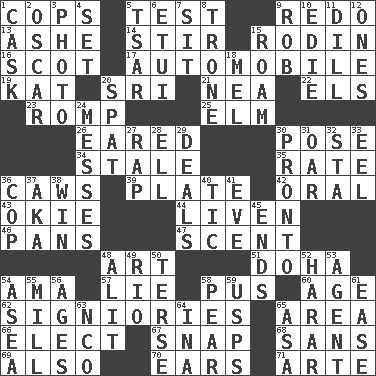 ACROSS 1. 911 reaches them 5. Trial 9. Redecorate 13. American tennis player Robert 14. Agitate 15. "The Thinker" sculptor 16. Native of Scotland 17. Form of transportation 19. Krazy ___ of comics 20. _ Lanka 21. Teachers' org. 22. Raised railways 23. Frolic 25. Shade tree 26. Having ears or earlike features 30. Airs 34. Having lost freshness 35. Pace 36. Crow sounds 39. Food holder 42. Spoken 43. Migrant worker of the '30s 44. Make or become more lively 46. Zero-star reviews 47. Odor 48. Nonscientific branch of learning 51. Capital of the state of Qatar 54. Nanny (var.) 57. Whopper 58. Product of festering 60. Ripen 62. Seigniories (variant) 65. Length times width 66. Voters do this 67. Fastener 68. Without 69. In addition 70. Hearing organs 71. Johnson of "Laugh-In" DOWN 1. Keg 2. Witty Wilde 3. Picture 4. Put into a specified state 5. Russian ruler of old 6. Needle case 7. Be seated 8. Heavy duty weighing machine 9. Director Reiner 10. Singer Brickell 11. Deli pickle 12. Singles 15. Wander 18. Cartoonist voice _ Blanc 20. Argument over a trivial matter 24. Makes clutter 27. Hit sharply and swiftly 28. Pipe bend 29. Allots cards 30. Right away 31. Boat paddle 32. R.R. building 33. Snakelike fish 36. Police officer (slang) 37. Alias (abbr.) 38. Victory 40. Nervous spasm 41. First lady 45. Extremities 48. Set down 49. _ de Janeiro 50. Laconic 52. Ethiopian city, capital of Harari 53. Rep 54. Toward the sea 55. Place where flour is made 56. Eons 58. Lightbulb-shaped fruit 59. United States Postal Service (abbr.) 61. Comfort 63. Non-commissioned officer (abbr.) 64. _ tizzy (2 wds.) 65. White ___ sheet