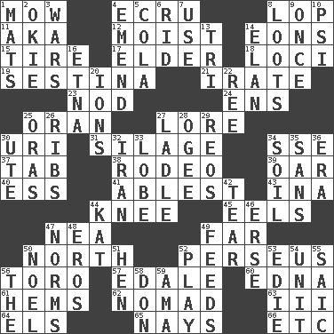 ACROSS 1. Cut the grass 4. Shade of tan 8. Chop off 11. Alias (abbr.) 12. Wet 14. Immeasurably long periods of time 15. Hoop that covers a wheel 17. A person who is older than you are 18. Locales 19. French poetic form 21. Feeling or showing extreme anger 23. Allow head to fall sleepily 24. Followers of ems 25. Northwest Algerian city 27. Old wives' tales, e.g. 30. RI univ. 31. Fodder prepared in a silo 34. Compass dir. 37. Keyboard key 38. Cowboy competition 39. Rowing implement 40. Curvy letter 41. Most capable 43. _ tizzy (2 wds.) 44. Leg joint 45. Snakelike fish 47. Teachers' org. 49. Distant 50. _ pole 52. Son of Zeus who helped slay Medusa 56. "Corrida" creature 57. Peak District village in England 60. Pulitzer Prize-winning author Ferber 61. Folds over and sews together 62. Wanderer 63. One more than two 64. Raised railways 65. Negative votes 66. And so on (abbr.) DOWN 1. Floor coverings 2. Migrant worker of the '30s 3. Armed conflicts 4. Make improvements or corrections to 5. Root beer relative 6. To free from 7. Purpose 8. Plunders 9. Single time 10. Air pressure measure (abbr.) 13. Three (prefix) 14. Enthusiasm 16. Inactive volcano in Sicily 20. Charged atoms 22. Portuguese money of account (variant) 25. Mouths or openings 26. Chest bones 27. Dipping utensil 28. Double curve, resembling the letter S 29. Vintage cars 30. Shoshoni 32. SW Asia republic 33. Ear part 34. Land 35. Without 36. Period 42. Lacerate 44. Krazy ___ of comics 46. Celtic language 47. Typical standards 48. Greek god of love 49. Gives food to 50. Christmas carol 51. Layer 52. Live dramatic performance 53. Singer Brickell 54. A single undivided whole 55. Ketch in the Levant 56. Definite Article 58. Spanish title 59. Nursemaid (var.)