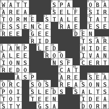 ACROSS 1. Electrical Unit 5. Health resort 8. Chief or king in Benin or Nigeria 11. Length times width 12. Oneself 14. Title for a knight 15. Singer Mel 17. Having lost freshness 18. Make lace 19. Center 21. Actress Charlotte 22. Compass dir. 23. Portuguese money of account (variant) 24. Turn to the right 25. Lair 27. To free from 28. Russian ruler of old 31. Desk light 35. Directed 37. Flintstone garb 38. Toward shelter 39. Friend of Pooh 41. _ the terrible 42. Charged atoms 43. Overdraft (abbr.) 45. Certainty 46. Make new 47. Domesticated feline 49. Viper 51. "We ___ not amused" (Victoria) 52. Ocean 55. The grampus (Milton) 57. Mayday 60. Thinks logically 62. Luau course 63. Bobsleighs 65. Table seasonings 66. Small child 67. Adolescent 68. The content of cognition 69. Filthy place 70. Girls' org. (abbr.) 71. Dormintory (informal) DOWN 1. Wetness 2. Came up 3. Laconic 4. Docile 5. Fast jet (abbr.) 6. Lightbulb-shaped fruit 7. Silent film actress Nazimova 8. Clearly or manifestly demonstrative 9. Prejudice 10. Johnson of "Laugh-In" 13. Nourish 16. Engineer (abbr.) 17. Sowing specialist 20. To provide with a ceiling 26. Value system 29. The sixth month of the Jewish calendar 30. Monthly bill 31. Den 32. _ vera 33. Ananias' fault 34. Mexican monetary units 36. Spanish title 40. Motion picture awards 44. Conductor's collection 48. Afternoon social gatherings 50. Inconspicuous attention getter 52. Twentieth part of a lira 53. Keyboard key 54. Indian state 55. Chooses 56. Carrot, for example 58. Cassini of fashion 59. Observes 61. Expressed in words 64. Heredity factor (abbr.)