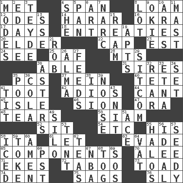 ACROSS 1. Was introduced to 4. Connect, as a bridge 8. Rich soil 12. Lyric poems 14. Ethiopian city, capital of Harari 16. Gumbo ingredient 17. 24-hour periods 18. Pleas 20. A person who is older than you are 22. Head covering 23. Eastern Standard Time (abbr.) 24. Perceive with the eye 25. Clumsy lout 28. Mountains (abbr.) 30. Competent 31. Fathers 35. Personal Computers (abbr.) 37. Chow _ 40. False hair 41. A blast of a horn 42. Goodbye (Sp.) 44. Patter 45. Capri or Wight 46. The Jewish people; Israel 47. Mouth or opening 48. Pulls apart 50. Thailand, formerly 52. Be seated 54. And so on (abbr.) 55. Part of HMS, perhaps 58. Call ___ day 61. Allow 63. Elude 65. Pieces 70. Toward shelter 71. Supplements with great effort 72. Off limits 73. Frog relative 74. Gouge 75. Settles 76. Insidious DOWN 1. Methods 2. Peak District village in England 3. Miss Universe 1986, Barbara Palacios _ 4. A female animal or person 5. Baking dish 6. Nonscientific branch of learning 7. Drug cop 8. Car dealer's back yard 9. Migrant worker of the '30s 10. Ancient Greek god of war 11. Vertical spar for supporting sails 13. Compass dir. 15. 480, 500 or 516 sheets of paper 19. Tenement units (abbr.) 21. Director Reiner 26. _ mater 27. Gives food to 29. "Cheers" or "Ellen" 30. Michaelmas daisies 32. Posterior 33. Inactive volcano in Sicily 34. Arrange properly for use 35. Introduce or present, as a question 36. Root beer relative 38. One more than two 39. Trap for birds or small mammals 41. Teat (slang) 43. In a ____ (agitated or irritated) 49. Grain storage tower 51. Adept person 53. Portable shelter 55. Auras 56. Standard of perfection 57. Full of seeds 58. On the rocks 59. Casino tip 60. So be it 62. Afternoon social gatherings 64. Large container 66. Pacific Standard Time (abbr.) 67. Basketball assoc. 68. Coat; cloak 69. Distress signal