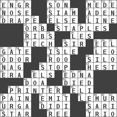 ACROSS 1. Engineer (abbr.) 5. Manchild 8. Ancient Persian 12. Characteristic smell of wine 13. Thailand, formerly 15. An important port of Yemen 16. Window treatment 18. Otherwise 19. Actor's bit 20. Globe 22. Paper fasteners 24. Chest bones 26. French article 27. Georgia ____ (Atlanta school) 28. Title for a knight 29. Snakelike fish 32. Yard entry 35. Capri or Wight 37. Lion 38. Scent 39. Friend of Pooh 40. Grain storage tower 41. Tired old horse 42. Halt 43. Command 44. Epoch 45. Raised railways 46. Pulitzer Prize-winning author Ferber 49. ___ good deed 50. Passed on 51. Hard copy producer 55. Connecticut Ivy Leaguer 56. Ache 57. Give off 59. Arboreal primate 63. Capital and largest city of Mongolia 64. "You Light Up My Life" star Conn 65. Indian skirt 66. Play the lead 67. To sift 68. Musical group of three DOWN 1. Conclusion 2. Not either 3. Girls' org. (abbr.) 4. Newsperson 5. Compass dir. 6. Petroleums 7. Political cartoonist Thomas 8. Promenades 9. Singer Brickell 10. Hiding places for outlaws 11. Compass dir. 14. Ear of corn 17. One of the Great Lakes 21. English channel? 23. For each 25. Upper-body garments 28. Inclined 29. Writer Wiesel 30. Snakelike fish 31. Plunder 32. Went 33. The sixth month of the Jewish calendar 34. Ancient Roman robe 36. "Barney Miller" actor Jack 40. Most questionable 42. Scheduled 45. A really long time 47. Pass on 48. 1994 drama film starring Jodie Foster 49. Middle Eastern gold or silver currency 51. Piece 52. Capital of Latvia 53. Arab leader 54. Travel on or in a vehicle 56. Product of festering 58. Standoff 60. Make imperfect 61. RI univ. 62. River (Sp.)