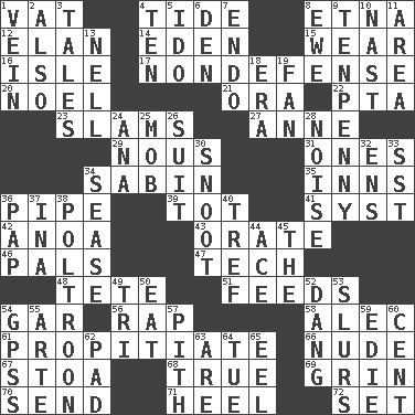 ACROSS 1. Large container 4. Event that recurs at intervals 8. Inactive volcano in Sicily 12. Enthusiasm 14. Paradise 15. Erode 16. Small island 17. Unrelated to defense, as in spending 20. Christmas carol 21. Mouth or opening 22. Parent Teacher Assoc. 23. Shuts with force 27. Queen of England 1702-14 29. Common sense 31. Singles 34. Unit of acoustic absorption 35. Taverns 36. Corncob 39. Small child 41. System (abbr.) 42. Small Philippine buffalo 43. Speak pompously 46. Friends 47. Technician 48. Wig 51. Eats 54. Slender fish 56. Reproach for some lapse or misdeed 58. Actor Baldwin 61. Appease 66. Naked 67. Portico 68. Loyal 69. Amused look 70. Post 71. The bottom of a shoe or boot 72. Put into a specified state DOWN 1. Distinctive style or manner 2. In addition 3. Lies 4. Nine, plus one 5. Wedding promise 6. Lair 7. Inside; within (prefix) 8. She-sheep 9. 3-inch nail 10. Political cartoonist Thomas 11. Length times width 13. 1994 drama film starring Jodie Foster 18. Period 19. Air blower 24. Santa ___, CA 25. Disorderly crowd 26. Set or collection 28. Annoying sound 30. Snout, nose 32. Followers of ems 33. Fast jet (abbr.) 34. Gospel singer Marvin 36. Infant food 37. _ tizzy (2 wds.) 38. Coward 40. Unclean, religiously 44. Adept person 45. Definite Article 49. Three (prefix) 50. Ingest 52. Mild oath, euphamism for damn 53. Runs notes together 54. Global Positioning Systems (abbr.) 55. Johnson of "Laugh-In" 57. Essential or central part 59. Singer Brickell 60. Penny 62. Groovy apt. 63. "We ___ not amused" (Victoria) 64. Third day of the wk. 65. Snakelike fish