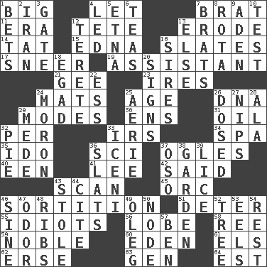 ACROSS 1. Of large size 4. Allow 7. Naughty child 11. Period 12. Wig 13. Wear away 14. Make lace 15. Pulitzer Prize-winning author Ferber 16. Chalkboards 17. Scornful expression 19. Helper 21. Unit of force equal to gravity 23. Angers 24. Floor coverings 25. Ripen 26. Heredity factor (abbr.) 29. Methods 30. Followers of ems 31. Petroleum 32. For each 33. Big collection agency 34. Health resort 35. Wedding promise 36. _-fi 37. Stares 40. Car or cant ending 41. Area sheltered from the wind 42. Alleged 43. Examine hastily 45. The grampus (Milton) 46. Conclusion 51. Prevent from occurring 55. Foolish or stupid persons 56. Ear part 58. To riddle 59. Impressive in appearance 60. Locale of original sin 61. Raised railways 62. Celtic language 63. Commissioned military rank (abbr.) 64. Eastern Standard Time (abbr.) DOWN 1. Stakes 2. SW Asia republic 3. Yard entry 4. Directed 5. Inactive volcano in Sicily 6. Beverages made from leaves 7. Naughty children 8. Roll call or roster of names 9. Arabian gulf 10. Trial 12. Cylindrical with tapered ends 13. Otherwise 16. Begets 18. Mild oath 20. Attaches a signature 22. Curvy letter 24. Person of subnormal intelligence 25. Nest on high 26. Administered medicine 27. Pinches, bites 28. Chicken ___ king 29. Ancient Persian 32. Sliced dessert 33. Ancient Celtic tribe of eastern Britain 36. Narrow boards 37. Bear (Spanish) 38. Place where plants grow 39. Louse (plural) 43. Fur scarf 44. Quote 46. Trig term 47. Aroma 48. Chest bones 49. Cassini of fashion 50. Connecting point 52. Relationship diagram 53. Snakelike fish 54. Respite 57. Benjamin's nick name