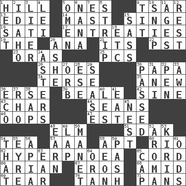 ACROSS 1. Land elevation 5. Singles 9. Russian ruler of old 13. Singer Brickell 14. Vertical spar for supporting sails 15. Burn superficially 16. Suttee (variant) 17. Pleas 19. Definite Article 20. Santa ___, CA 21. ___ a Wonderful Life 22. Pacific Standard Time (abbr.) 23. Mouths or openings 25. Personal Computers (abbr.) 26. Imelda's hoard 30. Dad 34. Laconic 35. Afresh 36. Celtic language 39. Calif. Air Force Base 42. Trig term 43. Burn to charcoal 44. Actors Connery and Penn 46. I made a mistake 47. First name in cosmetics 48. Shade tree 51. Neighbor of Neb. 54. Beverage made from leaves 57. Auto club (abbr.) 58. Fitting 60. _ de Janeiro 62. Abnormally rapid or deep breathing 65. Drawstring 66. Believer in; advocate of (suffix) 67. Greek god of love 68. Among 69. Lacerate 70. Hyperbolic tangent 71. Baking dishes DOWN 1. Behest 2. Potato state 3. 61 cubic inches 4. Flowery wreath 5. Presage 6. Nanny 7. Eastern Standard Time (abbr.) 8. Remove all contents or possession from 9. Teat (slang) 10. Clip 11. Eras 12. State of inaction 15. Backtalk 18. And so on (abbr.) 20. American tennis player Robert 24. Michaelmas daisies 27. Globe 28. Compass dir. 29. Gospel singer Marvin 30. Went by 31. Cuckoo 32. Animal enclosure 33. Deep reverence 36. Environmental prefix 37. 17th letter of the Greek alphabet 38. Plant excrement 40. French article 41. Consume 45. A home for chicks 48. Merit 49. Pet locale 50. French painter Edouard 52. Odor 53. Japanese brewing company 54. Not this but _ 55. Jane of fiction 56. Capital of Western Samoa 58. A really long time 59. Romantic infatuation 61. Likelihood 63. Ewer handle 64. Mouth or opening 65. Head covering