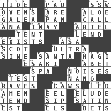 ACROSS 1. Event that recurs at intervals 5. Groovy apt. 8. Compass dir. 11. Baking chambers 13. "We ___ not amused" (Victoria) 14. Medicinal plant 15. An organ shaped like a helmet 16. Baking dish 17. Give a ring to 18. Santa ___, CA 19. "If ____ say so..." 21. Satellite of Uranus 22. Portable shelter 24. Grant temporary use of 25. Is 27. White ___ sheet 29. Highlander 30. Extreme 32. Trig term 33. Before Barbara or Clara 35. Wise men 39. 1973 Nobel Price Winner (Physics) Leo 41. Collude with 42. Health resort 43. Annoying sounds 45. Trial 48. Billionth: prefix 49. All-night dance parties 50. Crow sounds 52. Directed 55. So be it 56. Snakelike fish 57. Dodge 59. Look after 60. Small drink 61. Smooth fabric 62. Eastern Standard Time (abbr.) 63. Raised railways 64. Wagers DOWN 1. Ancient Roman robe 2. "Terrible" tsar 3. Conveyance 4. Compass dir. 5. Dad 6. Like ___ of sunshine 7. Lair 8. Killed 9. Having a sole or soles 10. Not ill 12. Virtuous person 14. 1/640 square mile 20. Mountains (abbr.) 21. Having or resembling wings 23. First name in cosmetics 25. Double-curved letter 26. One more than ninety 27. Keyboard modifier key 28. R.R. building 30. Corn or form start 31. At full speed 33. Plant excrement 34. Alias (abbr.) 36. Utter; complete 37. Turn to the right 38. It is 40. Fast planes 43. Compass dir. 44. Fertile tracts in a desert 45. Domesticates 46. Incident 47. Transmit 49. Pace 50. To provide with a ceiling 51. High mountains 53. Prepare for publication 54. Habitations of wild animals 56. Compass dir. 58. Experiment locale