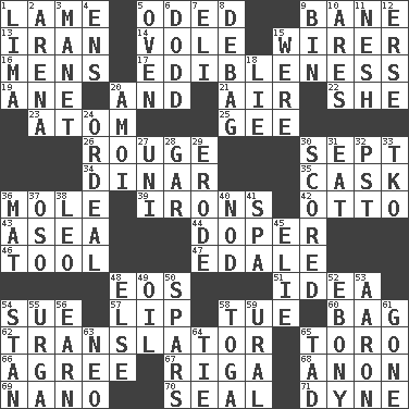 ACROSS 1. Unable to walk 5. Wrote a lyric poem 9. Object of repulsion 13. SW Asia republic 14. Short-tailed, large-bodied rat 15. One who wires 16. Not women's 17. The property of being fit to eat 19. One (Scot) 20. Also 21. Atmosphere 22. A female animal or person 23. Tiny particle 25. Unit of force equal to gravity 26. Makeup applied to the cheeks 30. Back-to-school mo. 34. Middle Eastern gold or silver currency 35. Keg 36. Undercover agent 39. Removes the wrinkles 42. Von Bismarck 43. Toward the sea 44. Drug addict 46. Utensil 47. Peak District village in England 48. Greek goddess of the dawn 51. The main thing one is thinking about 54. Take to court 57. Mouth edge 58. Third day of the wk. 60. Paper or plastic container 62. Interpreter 65. "Corrida" creature 66. Match 67. Port city in Latvia 68. Soon (poet.) 69. Billionth: prefix 70. Lick closed 71. Unit of force DOWN 1. Pale green bean 2. Sports stadium 3. French painter Edouard 4. Followers of ems 5. Baking chamber 6. Texas town _ City 7. Biblical high priest 8. Debunk (Brit. slang) 9. Storage container 10. Ancient Greek god of war 11. Tender 12. Celtic language 15. We are 18. Untruth 20. Mine, in Marseilles 24. Severe or trying experience 27. University (slang) 28. Slender fish 29. Eat (away) 30. Tallied 31. Erode 32. Pacific Standard Time (abbr.) 33. Ring climax 36. Floor protector 37. Bear (Spanish) 38. Lion 40. Lower and raise head in agreement 41. Health resort 45. Writer Wiesel 48. Otherwise 49. Lubricate 50. Practice fights 52. Black 53. Composer Copland 54. Comedian Laurel of Laurel & Hardy 55. Capital and largest city of Mongolia 56. Merit 58. Ancient Roman robe 59. Mountain range 61. Went 63. Modern: prefix 64. Standoff 65. Bit