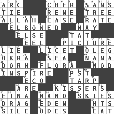 ACROSS 1. Curve 4. "Mermaids" star 8. Without 12. Make a knot 13. French philosopher Descartes 14. Woody plant 15. Assad's deity 18. Relaxation 19. Assign a rank or rating to 20. Shoved, as through a crowd 22. Can I? 23. Otherwise 24. Make lace 25. Snakelike fish 26. Photo 30. Falsehood 33. It is permitted: Lat. 36. Cassini of fashion 37. Gumbo ingredient 39. Ocean 40. Grandmother 41. Dormintory (informal) 42. Plants 44. Dreamland 45. Heighten or intensify 47. Pacific Standard Time (abbr.) 50. Environmental prefix 51. Canvas cover 53. "We ___ not amused" (Victoria) 54. Smoochers 57. Inactive volcano in Sicily 59. Billionth: prefix 61. Atmospheres 63. To draw with force 64. Paradise 65. Mountains (abbr.) 66. Drop; flow; fall 67. Lyric poems 68. Erode DOWN 1. _ moment's notice (2 wds.) 2. Cause heat under the collar 3. Cell (Danish) 4. Algonquian 5. Froth on beer 6. Followers of ems 7. To riddle 8. Ski resort town in Vermont 9. Like ___ of sunshine 10. Remaining after all deductions 11. Perceive with the eye 16. Competent 17. Flexible conduit 21. Water source 22. Big _ 24. Teat (slang) 26. Lightbulb-shaped fruit 27. ____ Bator 28. Western Nevada city 29. Mild oath 30. Farming town in central California 31. Image 32. Blunders 34. Small island 35. Corporate head (abbr.) 38. Electrical Measurement 42. Back 43. Tenement units (abbr.) 46. Frozen water 48. Backtalk 49. Long journey 52. A-one 53. Of or related to the anus 54. Leg joint 55. Charged atoms 56. Bristle 57. Begley and Asner 58. Three (prefix) 59. Modern: prefix 60. Find the sum of 62. Fast jet (abbr.)