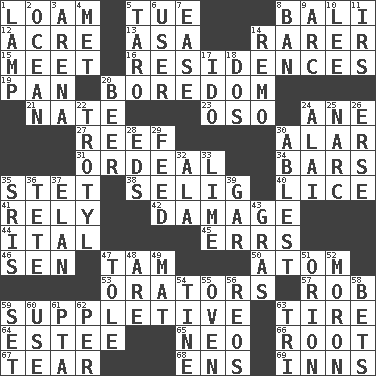ACROSS 1. Rich soil 5. Third day of the wk. 8. Indonesian resort city 12. 43,560 square feet 13. White ___ sheet 14. More valued for its uncommonness 15. Rendezvous 16. Homes 19. Baking dish 20. Mood resulting from idleness 21. Nathan's nickname 23. Bear (Spanish) 24. One (Scot) 27. Coral collection 30. Having or resembling wings 31. Severe or trying experience 34. Taverns 35. Proofreading order 38. Major League Baseball Commissioner Bud 40. Louse (plural) 41. Trust 42. Break 44. Slanted text style (abbr.) 45. Blunders 46. Elected rep. 47. Scottish cap 50. Tiny particle 53. Speakers 57. Director Reiner 59. Supplying deficiencies 63. Become fatigued 64. First name in cosmetics 65. Modern: prefix 66. Carrot, for example 67. Pull into pieces 68. Followers of ems 69. Lodging establishments DOWN 1. Desk light 2. Sea 3. Sports stadium 4. Was introduced to 5. Pacific island yam 6. One who uses or employs something 7. Relaxation 8. Bar 9. Curve 10. Area sheltered from the wind 11. Big collection agency 14. San ____ (Riviera town) 17. Wedding promise 18. Two (Sp.) 20. Fermented drink made from hops 22. TNT 24. Jai ____ 25. Drug cop 26. Celtic language 28. Begley and Asner 29. Nourish 30. Most capable 32. In the manner of 33. Citrus frut 35. Indian titles of respect 36. Wig 37. Liveliness 39. Slender fish 43. Pate de foie ____ 47. Lacquered or enameled metalware 48. "We ___ not amused" (Victoria) 49. Floor covering 51. Constellation of myth 52. Person of subnormal intelligence 54. Prong on a fork 55. Baking chamber 56. Vintage cars 58. Wagers 59. Arrange properly for use 60. Purpose 61. Parent Teacher Assoc. 62. For each 63. Three (prefix)