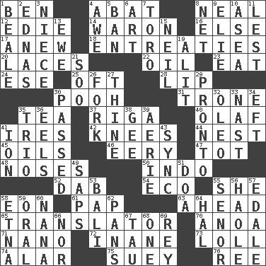 ACROSS 1. Benjamin's nick name 4. Blind as ____ 8. Actress Patricia 12. Singer Brickell 14. Make _____ (do battle with) 16. Otherwise 17. Afresh 18. Pleas 20. Shoestrings 22. Petroleum 23. Erode 24. Compass dir. 25. Often (poetically) 28. Mouth edge 30. "Silly old bear" 31. Heavy duty weighing machine 35. Afternoon social gathering 37. Capital of Latvia 40. Norwegian king 41. Angers 42. Leg joints 44. A home for chicks 45. Lubricates 46. Suggestive of the supernatural 47. Small child 48. Olfactory organs 50. _ china 52. Apply (a substance) by light strokes 54. Environmental prefix 55. A female animal or person 58. A really long time 61. Infant food 63. Toward the future 65. Interpreter 70. Small Philippine buffalo 71. Billionth: prefix 72. Empty; void 73. Hang loosely or laxly 74. Having or resembling wings 75. Chop _ 76. Portuguese money of account (variant) DOWN 1. Memphis, Tenn. Street 2. Ferber et al. 3. Sibling's daughter 4. Deep reverence 5. Prohibit 6. Nonscientific branch of learning 7. "Corrida" creature 8. Fish or hair follower 9. Writer Wiesel 10. At sea 11. For fear that 13. She-sheep 15. Famous astronaut Armstrong 19. Came down and settled, as after flight 21. "Barney Miller" actor Jack 26. Tined utensil 27. One or ones belonging to thee 29. Right away 30. Went by 32. Margarine 33. Political cartoonist Thomas 34. Bank Draft (abbr.) 35. Musical group of three 36. Snakelike fish 38. Turn to the right 39. Nest on high 41. Electrically charged atom 43. Synchronize (abbr.) 49. Plant excrements 51. ___ good deed 53. Indonesian resort city 55. Sir (Sp.) 56. White Person, in Hawaii 57. Peak District village in England 58. Inactive volcano in Sicily 59. Of the mouth 60. Grandmother 62. Baking dishes 64. Actor Linden 66. Not either 67. The 19th letter of the Greek alphabet 68. Single 69. Marina Del _, California