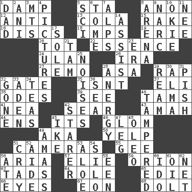 ACROSS 1. Moist 5. R.R. building 8. At once, immediately (arch.) 12. Opposed to 13. Root beer relative 15. Libertine 16. Plates 18. Naughty children 19. 4th largest of the Great Lakes 20. Small child 22. Core 24. Uhlan (variant) 26. Lyricist Gershwin 27. San ____ (Riviera town) 28. White ___ sheet 29. Reproach for some lapse or misdeed 32. Yard entry 35. Is not 37. Connecticut Ivy Leaguer 38. Lyric poems 39. Perceive with the eye 40. Scottish caps 41. Teachers' org. 42. Scorch 43. Nursemaid 44. Followers of ems 45. It is 46. Seize upon or latch onto something 49. Alias (abbr.) 50. Sharp bark 51. Devices for capturing images 55. Unit of force equal to gravity 56. Operatic vocal solo 57. Writer Wiesel 59. Greek mythologigal hunter 63. Bits 64. Hero or heavy, e.g. 65. Singer Brickell 66. Snake ____ (dice throw) 67. A really long time 68. Stupid person DOWN 1. Male parent 2. Black tropical American cuckoo 3. Mountains (abbr.) 4. Photos 5. _-fi 6. Heavy book 7. High mountains 8. Sports stadium 9. Drug cop 10. Migrant worker of the '30s 11. Born 14. Help 17. Not divided or shared with others 21. Scottish cap 23. Epoch 25. Annoying sounds 28. Disorder of the immune system 29. 480, 500 or 516 sheets of paper 30. _ mater 31. Expression of disdain 32. Went 33. An important port of Yemen 34. Beverages made from leaves 36. Ocean 40. ________ with (broke a safety seal) 42. A viewer who gazes fixedly 45. Mamie's mate 47. Part of a journey 48. Butter sub 49. Collect or gather 51. Supercomputer manufacturer 52. Assistant 53. Medicinal plant 54. Grain storage tower 56. Had dinner 58. Car or cant ending 60. Wedding promise 61. Lubricate 62. Remaining after all deductions