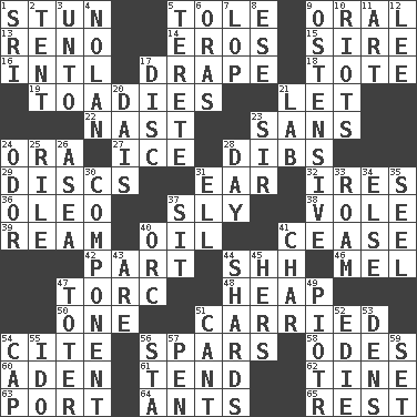 ACROSS 1. Make senseless or dizzy 5. Lacquered or enameled metalware 9. Relating to the mouth 13. Former U.S. Attorney General Janet 14. Greek god of love 15. The founder of a family 16. International (abbr.) 17. Window treatment 18. Haul 19. Sycophants 21. Allow 22. Political cartoonist Thomas 23. Without 24. Mouth or opening 27. Frozen water 28. Rights 29. Flat circles 31. Hearing organ 32. Angers 36. Butter sub 37. Cunning 38. Short-tailed, large-bodied rat 39. 480, 500 or 516 sheets of paper 40. Lubricate 41. Desist 42. Role in a play 44. Quiet! 46. Cartoonist voice _ Blanc 47. Torque (variant) 48. Pile 50. Single 51. Borne 54. Quote 56. Practice fights 58. Lyric poems 60. Arabian gulf 61. Look after 62. Prong on a fork 63. Left side of a ship or aircraft 64. Pismires 65. State of inaction DOWN 1. Indian title of respect (Mr.) 2. Portable shelter 3. To (old English) 4. Pitcher Ryan 5. Cylindrical with tapered ends 6. Mouths or openings 7. Trim (branches) 8. Compass dir. 9. Clearly or manifestly demonstrative 10. Disturbances 11. Nonscientific branch of learning 12. Area sheltered from the wind 17. Plate 20. Raised platform 21. Experiment locale 23. Title for a knight 24. Scent 25. Cause heat under the collar 26. Toward the sea 28. 24 hours 30. Piece 31. Pipe bend 33. Wander aimlessly 34. Otherwise 35. Stitch closed the eyes of (a falcon) 37. Be seated 40. The grampus (Milton) 41. Burn to charcoal 43. "We ___ not amused" (Victoria) 44. Pottery fragments 45. Possessive pronoun 47. Carrier 49. Peter (Polish) 51. Patter 52. Singer Brickell 53. Cub Scout units 54. Head covering 55. Wedding promise 56. R.R. building 57. Writing instrument 59. Arrange properly for use