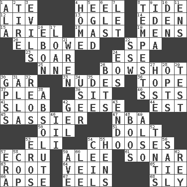 ACROSS 1. Had dinner 4. The bottom of a shoe or boot 8. Event that recurs at intervals 12. 54 in ancient Rome 13. Stare 14. Locale of original sin 15. Satellite of Uranus 18. Vertical spar for supporting sails 19. Not women's 20. Turned at an angle; bent 22. Health resort 23. Fly high 24. Compass dir. 25. Compass dir. 26. The distance a bow sends an arrow 30. Slender fish 33. Unclothed pictures 36. Drink excessively 37. Entreaty 39. Be seated 40. Fast planes 41. Oscar Madison type 42. Honkers 44. Eastern Standard Time (abbr.) 45. More disrespectful 47. Basketball assoc. 50. Lubricate 51. Dunce 53. Connecticut Ivy Leaguer 54. Elects 57. Shade of tan 59. Toward shelter 61. Echolocation 63. Carrot, for example 64. Distinctive style or manner 65. Standoff 66. Domed church section 67. Snakelike fish 68. Mischievous DOWN 1. According to 2. Hoop that covers a wheel 3. Vices 4. Residence 5. Mild oath 6. Raised railways 7. Allow 8. Storms 9. The content of cognition 10. Lair 11. Followers of ems 16. Inky black, to poets 17. Grant temporary use of 21. Songbird 22. Compass dir. 24. Greek goddess of the dawn 26. Stakes 27. Stockings 28. Elects 29. Trial 30. Global Positioning Systems (abbr.) 31. Silent film actress Nazimova 32. Vintage cars 34. One who makes use of a thing 35. Expire 38. Utter; complete 42. Set 43. Inside; within (prefix) 46. One more than two 48. Expressions of contempt or scorn 49. In addition 52. Portable shelters 53. Greek god of love 54. To provide with a ceiling 55. Coop moms 56. Move on water 57. Epoch 58. Police officer (slang) 59. "___ Maria" 60. Area sheltered from the wind 62. Marina Del _, California