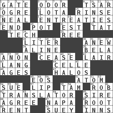 ACROSS 1. Yard entry 5. Aroma 9. Russian ruler of old 13. Legendary monster 14. Globular water bottle used in Asia 15. Wash lightly 16. Be tempered by heat 17. Pleas 19. Conclude 20. Cooking vessel 21. Eastern Standard Time (abbr.) 22. Make lace 23. Technical 25. To sift 26. 61 cubic inches 30. Afresh 34. Place in a line 35. Actor Lugosi 36. Soon (poet.) 39. Stop 42. Den 43. Long (Scottish) 44. Cell (Danish) 46. Eras 47. Auras 48. Greek goddess of the dawn 51. Tiny particle 54. Institute legal proceedings 57. Mouth edge 58. Scottish cap 60. Director Reiner 62. Interpreter 65. Beget 66. Match 67. California wine valley 68. Carrot, for example 69. Monthly bill 70. Chop _ 71. Restaurants DOWN 1. Went 2. Rep 3. Barter 4. Snakelike fish 5. Margarine 6. Do not 7. Baseball player Mel 8. More valued for its uncommonness 9. Teat (slang) 10. In a ____ (agitated or irritated) 11. Toward the sea 12. Relief 15. Pace 18. Compass dir. 20. Silvers or Donahue 24. Gives out a loud, resonant sound 27. Nervous spasm 28. Compass dir. 29. Arrive at 30. Most capable 31. Teachers' org. 32. Connecticut Ivy Leaguer 33. Armed conflict 36. According to 37. Tired old horse 38. Single 40. Ocean 41. Pipe bend 45. Rich soil 48. Otherwise 49. Petroleum 50. Connects, as a bridge 52. Constellation of myth 53. Person of subnormal intelligence 54. Play the lead 55. Goad 56. Merit 58. Drink excessively 59. Like ___ of sunshine 61. Stakes 63. Remaining after all deductions 64. The 19th letter of the Greek alphabet 65. _ Lanka