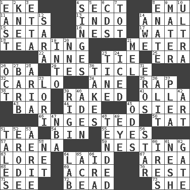 ACROSS 1. Supplement with great effort 4. Religious group 8. Australian flightless bird 11. Pismires 13. Southeast Asian peninsula 14. Of or related to the anus 15. Stalk of a moss capsule 16. A home for chicks 17. Electrical Unit 18. Rending 21. Distance measurement 22. Queen of England 1702-14 23. Make a knot 25. Epoch 26. Chief or king in Benin or Nigeria 29. A testis 32. Monte _, Las Vegas Hotel/Casino 34. A saturated hydrocarbon 35. Strike 38. Musical group of three 39. Moved through 41. Rounded earthenware pot or jar 43. Soap unit 44. Binary compound 45. Flexible twig of a willow tree 46. Eaten 50. Make lace 51. Afternoon social gathering 54. Storage container 55. Sight organs 57. Sports stadium 59. Inhabiting a nest 63. Old wives' tales, e.g. 64. Put down 67. Type of rug 68. Prepare for publication 69. 43,560 square feet 70. Remainder 71. Perceive with the eye 72. Necklace unit 73. A female animal or person DOWN 1. Compass direction 2. Leg joint 3. Singer James 4. Scorches 5. Compass dir. 6. Music discs 7. Small child 8. Maternal 9. Mother 10. Extremist 12. "Two Mules for Sister ____" 14. Deep reverence 19. To the inside or interior of 20. Compass dir. 21. Cartoonist voice _ Blanc 23. Prong on a fork 24. On the rocks 26. Sep. follower 27. Sharp remark 28. Roberta Peters solo 30. Proceeds 31. Greek god of love 33. Australian parrot (variant) 36. Came down and settled, as after flight 37. Entreaty 39. Swiss mountan, "Queen of the Mountains" 40. An important port of Yemen 42. Nonscientific branch of learning 45. Lyric poems 47. Basketball assoc. 48. Looked after 49. Sight organ 51. Lies 52. Wear away 53. Nest on high 56. Play the lead 58. Remaining after all deductions 60. Angers 61. Delicate 62. Yard entry 64. Experiment locale 65. Adept person 66. Retirement account (abbr.)