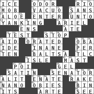 ACROSS 1. Frozen water 4. Scent 8. River (Sp.) 11. Disorderly crowd 12. In a vacuum (with "in") 14. Without 15. _ vera 17. Keyboard key 18. To (old English) 19. Pulling on something suddenly 21. Satellite of Uranus 23. Followers of ems 24. Had dinner 25. Trial 27. Halt 30. Assist 31. Declaimed 34. Chief or king in Benin or Nigeria 37. Binary compound 38. Empty; void 39. For each 40. "___ Little Indians" 41. Greek mezzo-soprano Agnes 43. Affectionate concern, for short 44. Small island 45. Vertical spar for supporting sails 47. Luau course 49. Set 50. Smooth fabric 52. Elected representative 56. Set down 57. Maternal 60. Libertine 61. Billionth: prefix 62. Off-Broadway awards 63. Storage container 64. It is 65. Johnson of "Laugh-In" 66. Observe DOWN 1. "If ____ say so..." 2. Root beer relative 3. Inky black, to poets 4. Baking chambers 5. Mild oath, euphamism for damn 6. Sep. follower 7. Sorrow 8. Indian princess (variant) 9. International (abbr.) 10. Bear (Spanish) 13. Mouth or opening 14. Set of matching outer garments 16. Makes supply last 20. To the inside or interior of 22. Strike 25. Periodic rise and fall of the sea level 26. Locale of original sin 27. Showing deterioration from age 28. Portable shelter 29. Lyric poems 30. Small island 32. Chest bones 33. Of or related to the anus 34. Elects 35. Waist strap 36. Curve 42. So be it 44. One more than two 46. Having or resembling wings 47. Aches 48. "Beetle Bailey" pooch 49. Honkers 50. Narrow board 51. Modern: prefix 52. Proofreading order 53. Bar bills 54. Migrant worker of the '30s 55. French philosopher Descartes 56. Cuckoo 58. Basketball assoc. 59. Wind