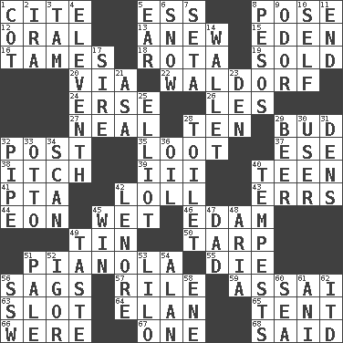 ACROSS 1. Quote 5. Curvy letter 8. Airs 12. Taken by mouth 13. Afresh 15. Locale of original sin 16. Makes less strong or intense 18. Round or rotation of duties 19. Disposed of to a purchaser 20. By way of 22. Apple salad 24. Celtic language 26. French article 27. Be tempered by heat 28. "___ Little Indians" 29. Partially opened flower 32. Mail 35. Spoils 37. Compass dir. 38. Hankering 39. One more than two 40. Adolescent 41. Parent Teacher Association (abbr.) 42. Hang loosely or laxly 43. Blunders 44. A really long time 45. Soggy 46. Dutch treat 49. Shallow baking pan 50. Canvas cover 51. Player piano 55. Pass on 56. Droops 57. Cause heat under the collar 59. Slender Brazilian palm 63. Notch 64. Style 65. Portable shelter 66. We are 67. Single 68. Stated DOWN 1. Small bed 2. Lyricist Gershwin 3. Scottish cap 4. Veterans Day date 5. Ewer handle 6. Overwhelm 7. Bristle 8. Mexican monetary units 9. Aroma 10. Automatically 11. Conclusion 14. Place for singles 17. Male parent of an animal 21. White ___ sheet 23. Lair 25. American author Paul (1891-1958) 28. Bathroom 29. Fermented drink made from hops 30. One who uses or employs something 31. Cub Scout units 32. Corncob 33. Von Bismarck 34. Skim 36. Petroleum 40. Storms 42. Poe poem 45. Acquire through effort 47. Male parent 48. Roberta Peters solo 49. Clothes sense 51. Light colored 52. Russian composer Stravinsky 53. _ and Stitch 54. ____ Jay Lerner 56. Compass dir. 58. Compass dir. 60. Ocean 61. Black tropical American cuckoo 62. It would