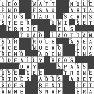 ACROSS 1. Lion 4. Electrical Unit 8. Undercover agent 12. Conclusion 13. Son of Isaac 14. Roberta Peters solo 15. Small amounts or degrees 17. Drawn tight 18. Fraudulent business schemes 19. Bull 21. University (slang) 23. Put into a specified state 24. Bert's buddy 26. Raised railways 28. Frog relative 30. Of or relating to Laos or its people 34. Title for a knight 37. Hero or heavy, e.g. 39. Toward the sea 40. Adept person 41. New (sp.) 43. Myrna of the movies 44. Tear apart 46. Arabian gulf 47. Followers of ems 48. Under perfect conditions 51. Vintage cars 54. 24 hours 55. Connects, as a bridge 58. Purpose 61. Unit of force equal to gravity 63. Marketplace scale 65. Amusement-park features 67. Sums up 71. Collude with 72. Travels 73. Painter Guido (1575-1642) 74. Allow 75. Queen of England 1702-14 76. Fastener 77. Epoch DOWN 1. Allows 2. Maternal 3. More peculiar 4. Soggy 5. White ___ sheet 6. The 19th letter of the Greek alphabet 7. Ballerina skirt 8. Big _ 9. Mouths or openings 10. Citrus frut 11. 90 degrees 16. Emitted 18. Grain storage tower 20. _ de Janeiro 22. Teachers' org. 25. Merit 27. R.R. building 29. A city in N France, SE of Calais 30. Crowbar 31. Capri or Wight 32. A really long time 33. Negative votes 34. Indian skirt 35. On the rocks 36. French philosopher Descartes 38. Directed 42. Singles 45. Male parent 49. Fails to keep up a pace 50. Potassium hydroxide 52. Choose 53. "Two Mules for Sister ____" 56. Having high moral qualities 57. Contemptuous expression 58. Capital and largest city of Mongolia 59. The Jewish people; Israel 60. Locale of original sin 62. Hearing organs 64. Singer James 66. Compass dir. 68. Lair 69. Heredity factor (abbr.) 70. Small drink