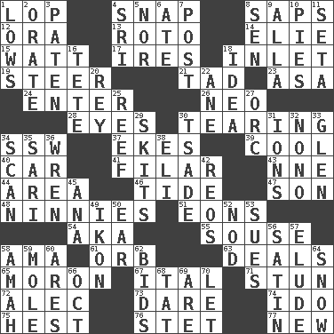 ACROSS 1. Trim (branches) 4. Fastener 8. Plant excrements 12. Mouth or opening 13. Printing process, for short 14. Writer Wiesel 15. Electrical Unit 17. Angers 18. An arm off of a larger body of water 19. Bull 21. Bit 23. White ___ sheet 24. Keyboard key 26. Modern: prefix 28. Snake ____ (dice throw) 30. Pulling into pieces 34. Compass dir. 37. Supplements with great effort 39. Calm and collected 40. 4-wheeled motor vehicle 41. Of or pertaining to a thread or threads 43. Compass dir. 44. Length times width 46. Event that recurs at intervals 47. Manchild 48. Simpletons 51. Immeasurably long periods of time 54. Alias (abbr.) 55. Boozer 58. Housemaid (var.) 61. Globe 63. Allots cards 65. Person of subnormal intelligence 67. Slanted text style (abbr.) 71. Surprise greatly 72. Actor Baldwin 73. Have the gumption 74. Wedding promise 75. Command 76. Proofreading order 77. ___ Haven, CT DOWN 1. Moos 2. Declaim 3. Eucharist need 4. Indian title of respect (Mr.) 5. And not 6. Had dinner 7. Mail 8. Elected rep. 9. Silent film actress Nazimova 10. Sliced desserts 11. Stalk of a moss capsule 16. False hair 18. The content of cognition 20. Marina Del _, California 22. A saturated hydrocarbon 25. Coral collection 27. The grampus (Milton) 29. Burlesque acts 30. Sadhe (variant) 31. Charged particles 32. Words to Nanette 33. Small, secluded valley 34. Examine minutely or intensely 35. Indian skirt 36. Songbird 38. Connecticut Ivy Leaguer 42. Vintage cars 45. Santa ___, CA 49. Picture 50. Hearing organ 52. Dreamland 53. Institutes legal proceedings 56. Smooth fabric 57. Dodge 58. Nursemaid 59. Undercover agent 60. Ancient Greek god of war 62. Auction offers 64. Overwhelm 66. Sep. follower 68. Make lace 69. "We ___ not amused" (Victoria) 70. Allow