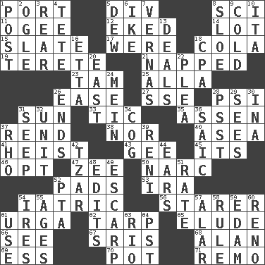 ACROSS 1. Left side of a ship or aircraft 5. HTML Container Element 8. _-fi 11. Double curve, resembling the letter S 12. Supplemented with great effort 14. Car dealer's back yard 15. Schedule 17. We are 18. Root beer relative 19. Cylindrical with tapered ends 21. Slept 23. Scottish cap 25. Silent film actress Nazimova 26. Comfort 27. Compass dir. 28. Air pressure measure (abbr.) 31. Player for Phoenix 33. Nervous spasm 35. NE Netherlands city 37. Tear apart 38. Not either 40. At sea 41. Robbery 43. Turn to the right 45. ___ a Wonderful Life 46. Choose 47. Last letter of the English alphabet 50. Drug cop 52. Writing tablets 53. Lyricist Gershwin 54. Of or pertaining to medicine 56. A viewer who gazes fixedly 61. Capital and largest city of Mongolia 62. Canvas cover 65. Evade 66. Observe 67. Indian titles of respect 68. Actor Alda or Thicke 69. Curvy letter 70. Plant holder 71. San ____ (Riviera town) DOWN 1. Mail 2. Stare at amorously 3. Tail end 4. Wig 5. Morning condensation 6. D.D.E's nickname 7. Actresses Bloom and Felton 8. A type of plum 9. Having a low temperature 10. Call ___ day 13. Allots cards 16. Singer James 18. Numbers guy (abbr.) 20. Compass direction 22. Entreaty 24. Chow _ 26. Extremities 28. Inconspicuous attention getter 29. Perceives with the eye 30. _ tizzy (2 wds.) 31. Ooze 32. A single undivided whole 34. Gear tooth 36. Ketch in the Levant 37. 17th letter of the Greek alphabet 39. Painter Guido (1575-1642) 42. Czar 44. Hearing organs 48. Prepares for publication 49. Fortification 51. Pace 52. Parent Teacher Assoc. 54. Angers 55. Ripens 57. Having or resembling wings 58. Governing power 59. Dutch treat 60. Former U.S. Attorney General Janet 61. Purpose 63. _ de Janeiro 64. Pacific Standard Time (abbr.)