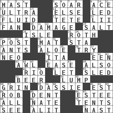 ACROSS 1. Vertical spar for supporting sails 5. Fly high 9. Adept person 12. Extreme 14. Otherwise 15. Directed 16. Watery 17. False hair 18. Cards in a Roman deck? 19. Avid follower 20. Break 23. Table seasoning 24. Small island 25. Writer of Portnoy's Complaint (1969) 27. Mail 30. Floor covering 32. R.R. building 33. Pismires 34. Medicinal plant 36. Attempt 38. Modern: prefix 39. Call ___ day 40. Car or cant ending 43. Leather borer 46. Relaxation 48. In addition 49. River (Sp.) 51. Allow 52. Downhill vehicle 53. Fermented drink made from hops 54. Mass 56. Smile widely 58. Small ungulate mammals of Africa 61. Eastern Standard Time (abbr.) 64. Director Reiner 65. Undesirable depression on a surface 66. First name in cosmetics 68. Everything 69. Nathan's nickname 70. Portable shelters 71. Perceive with the eye 72. Came down and settled, as after flight 73. Political cartoonist Thomas DOWN 1. Bungle 2. Silent film actress Nazimova 3. Astound 4. Three (prefix) 5. Bristle 6. Cassini of fashion 7. Michaelmas daisies 8. To sift 9. Assad's deity 10. To provide with a ceiling 11. Prepare for publication 13. Sums up 21. _ mater 22. Ear of corn 23. Play the lead 24. ___ a Wonderful Life 26. Baseball player Mel 27. Baking dish 28. Single 29. Portico 31. "_____ Recall" 35. Artist's stands 37. Shout 41. Compass dir. 42. Lower and raise head in agreement 44. Songbird 45. Falsehood 47. Needle case 48. Cleo's killer 50. Severe or trying experience 53. God's Word 55. Confront 56. Pate de foie ____ 57. Hero or heavy, e.g. 59. Against 60. Proofreading order 61. Inactive volcano in Sicily 62. Puts into a specified state 63. Trial 65. Heredity factor (abbr.) 67. Elected rep.