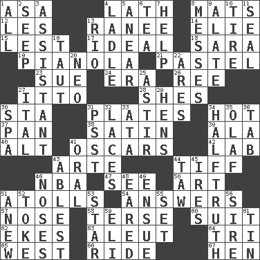 ACROSS 1. White ___ sheet 4. Thin strip of wood or metal 8. Floor coverings 12. French article 13. The wife of a rajah (variant) 14. Writer Wiesel 15. For fear that 17. Standard of perfection 18. "Two Mules for Sister ____" 19. Player piano 21. Soft color 23. Take to court 24. Epoch 26. Portuguese money of account (variant) 27. "Tell ____ the Marines!" 28. "______ My Girl" (Turtles hit) 30. R.R. building 31. Food holders 34. Being at a high temperature 37. Baking dish 38. Smooth fabric 39. According to 40. The first octave above the treble staff 41. Motion picture awards 42. Experiment locale 43. Johnson of "Laugh-In" 44. Small quarrel 46. Basketball assoc. 47. Perceive with the eye 50. Tate display 51. Ringlike coral islands and reefs 54. Responses 57. Sense of smell 58. Laconic 60. Set or collection 62. Makes supply last 63. Eskimo relative 64. Three (prefix) 65. 270 degrees 66. Travel on an animal 67. Layer DOWN 1. 100% 2. Ooze 3. Helper 4. Dipping utensil 5. Approach 6. Afternoon social gathering 7. Assist 8. Makes clutter 9. Having winglike extensions 10. Hoop that covers a wheel 11. Lick closed 13. _ de Janeiro 16. Drawn tight 20. Modern: prefix 22. Ancient Greek god of war 25. Moving or stirring 27. Slanted text style (abbr.) 29. Coop moms 30. Health resort 31. Inconspicuous attention getter 32. Shoestrings 33. _ moment's notice (2 wds.) 34. Not exactly gospel 35. Norwegian king 36. Bar bill 41. Taken by mouth 43. Most capable 44. The 23rd letter of the Hebrew alphabet 45. Angers 46. Olfactory organs 48. Having ears or earlike features 49. Take place subsequently 51. Afresh 52. Puff or smoke 53. Play the lead 55. Arrange properly for use 56. Beget 59. Connecticut Ivy Leaguer 61. Shallow baking pan