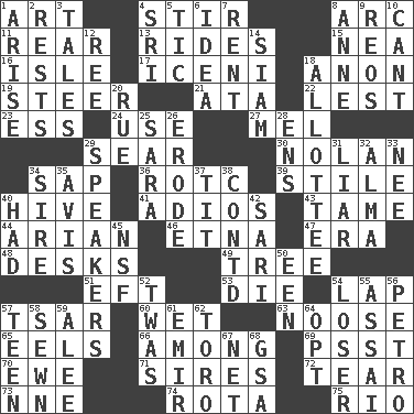 ACROSS 1. Nonscientific branch of learning 4. Agitate 8. Curve 11. Located in or toward the back 13. Amusement-park features 15. Teachers' org. 16. Capri or Wight 17. Ancient Celtic tribe of eastern Britain 18. Soon (poet.) 19. Navigate 21. "One Day ___ Time" 22. For fear that 23. Curvy letter 24. Purpose 27. Cartoonist voice _ Blanc 29. Scorch 30. Pitcher Ryan 34. Plant excrement 36. College mil. group 39. Vertical member of a panel or frame 40. Hub of activity 41. Goodbye (Sp.) 43. Not wild 44. Believer in; advocate of (suffix) 46. Inactive volcano in Sicily 47. Period 48. Writing tables 49. Relationship diagram 51. Lizard (obsolete) 53. Pass on 54. Infant locale 57. Russian ruler of old 60. Dripping 63. Trap for birds or small mammals 65. Snakelike fish 66. Amid 69. Inconspicuous attention getter 70. She-sheep 71. Founders of families 72. Pull into pieces 73. Compass dir. 74. Roll call or roster of names 75. _ de Janeiro DOWN 1. Originate 2. Musical pauses 3. Lies 4. Indian title of respect (Mr.) 5. Nervous spasm 6. The content of cognition 7. Monthly bill 8. Singer Murray 9. Vintage cars 10. Patter 12. To separate or throw off 14. Thailand, formerly 18. One to whom something is allotted 20. Sorrow 25. "Two Mules for Sister ____" 26. Wear away 28. Followers of ems 29. Orators 31. One who doesn't tell the truth 32. _ mater 33. Born 34. Male parent of an animal 35. Deliberation 37. Teat (slang) 38. Continued (abbr.) 40. Possessed 42. Indian skirt 45. Overdraft (abbr.) 50. Car or cant ending 52. It was, poetically 54. Failure 55. Slender Brazilian palm 56. Stone: prefix 57. Adolescent 58. Stitched 59. Toward shelter 61. Arab leader 62. "Corrida" creature 64. Choose 67. Fish or hair follower 68. Girls' org. (abbr.)