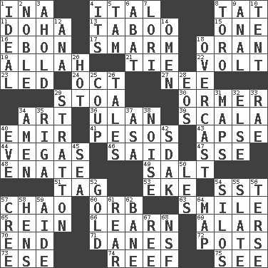 ACROSS 1. _ tizzy (2 wds.) 4. Slanted text style (abbr.) 8. Make lace 11. Capital of the state of Qatar 13. Off limits 15. Single 16. Inky black, to poets 17. Excessive but superficial compliments 18. NW Algerian seaport 19. Assad's deity 21. Standoff 22. Electrical Unit 23. Directed 24. Sep. follower 27. Born 29. Portico 30. Abalone 34. Nonscientific branch of learning 36. ____ Bator 39. Any of the three canals of the cochlea 40. Arab leader 41. Mexican monetary units 43. Domed church section 44. Viva Las _ 46. Expressed in words 47. Compass dir. 48. Maternal 49. Table seasoning 51. Label 53. Supplement with great effort 54. Fast jet (abbr.) 57. US Secretary of Labor Elaine L. _ 60. Globe 63. Grin 65. It's straight from the horse's mouth 66. Acquire or gain knowledge or skills 69. Having or resembling wings 70. Conclude 71. Natives or inhabitants of Denmark 72. Plant holders 73. Compass dir. 74. Coral ridge 75. Perceive with the eye DOWN 1. Perfect 2. Impressive in appearance 3. Hold, grip (Informal) 4. ___ a Wonderful Life 5. Scottish cap 6. Blind as ____ 7. Australian parrot (variant) 8. "Corrida" creature 9. Of or related to the anus 10. Portable shelter 12. Santa ___, CA 14. Sign of something about to happen 18. Cloudy 20. Being at a high temperature 25. Overturn; upset 26. Lies 28. Greek goddess of the dawn 29. Ski resort town in Vermont 31. Atlas contents 32. Otherwise 33. Actress Charlotte 34. So be it 35. Port city in Latvia 37. White ___ sheet 38. Annoying sound 40. First lady 42. Neighbor of Neb. 45. Ocean 50. French article 52. Gilded 54. Grain storage towers 55. Schedule 56. Laconic 57. Algonquian 58. Coop moms 59. Helper 61. Posterior 62. Object of repulsion 64. Atlas unit 67. To sift 68. Science/research agcy.