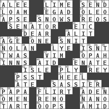 ACROSS 1. Toward shelter 5. Citrus frut 9. Post 13. Rich soil 14. Mild oath 15. Margarine 16. Domed church section 17. Overwhelms 18. Vintage cars 19. Elected representative 21. And so on (abbr.) 22. Letter starter 23. Came down and settled, as after flight 24. Personal question 27. Single 28. In a ____ (agitated or irritated) 29. Pitcher Ryan 31. Sodium hydroxide 32. Is not 36. It was, poetically 37. Zeal 38. Brightly colored fish 39. Lodging establishments 40. Help 41. Related on the mother's side 42. Small island 44. Strand of rope, yarn or thread 46. Marina Del _, California 47. Inconspicuous attention getter 48. Person who is morally reprehensible 50. Had dinner 51. More impudent 54. Dad 56. Seductive woman who exploits men 58. An important port of Yemen 60. Presage 61. San ____ (Riviera town) 62. Billionth: prefix 63. Small pie 64. I made a mistake 65. Among DOWN 1. According to 2. Chops off 3. Comfort 4. Make improvements or corrections to 5. Poe poem 6. Composer Stravinsky 7. Opening into something insatiable 8. Begley and Asner 9. Determination 10. Choose 11. Modern: prefix 12. Two (Sp.) 17. Comedian Laurel of Laurel & Hardy 20. A really long time 21. Connecticut Ivy Leaguer 23. One (Scot) 24. Opposed to 25. Woman's formal wear 26. Enthusiasm 28. Symbol (abbr.) 30. Aide 31. Flaplike covering 33. Coast Guard woman 34. Nathan's nickname 35. Those things 37. Compete 40. Keyboard modifier key 41. Snake ____ (dice throw) 43. Compass dir. 44. N Egypt peninsula 45. For fear that 47. Some stationery 49. Climbing, woody, usually tropical vines 51. Simple or foolish person 52. Dutch treat 53. Painter Guido (1575-1642) 54. Plant holder 55. Wet nurse (var.) 56. From 57. Lion 59. Allow head to fall sleepily