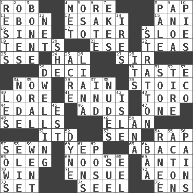 ACROSS 1. Director Reiner 4. Greater amount 8. Infant food 11. Inky black, to poets 13. 1973 Nobel Price Winner (Physics) Leo 15. Cuckoo 16. Trig term 17. Carrier 18. _ gin 19. Portable shelters 21. Compass dir. 22. Afternoon social gatherings 23. Compass dir. 24. Actor Linden 27. Title for a knight 29. Tenth: prefix 30. Clothes sense 34. At this time 36. Precipitation 39. Unemotional 40. Old wives' tales, e.g. 41. World-weariness 43. "Corrida" creature 44. Peak District village in England 46. Does sums 47. Single 48. Exchanges for money 49. Style 51. It would 53. Elected rep. 54. Strike 57. Stitched 60. Slangy assent 63. Phillipine bananalike plant 65. Cassini of fashion 66. Trap for birds or small mammals 69. Opposed to 70. Acquire through effort 71. Take place subsequently 72. Period of immesurable duration 73. Put into a specified state 74. Sew up the eyelids of hawks and falcons 75. Followers of ems DOWN 1. Musical pauses 2. Off-Broadway awards 3. Maid-servant 4. Was introduced to 5. Bear (Spanish) 6. Assign a rank or rating to 7. Supplements with great effort 8. Diluted with white 9. Small Philippine buffalo 10. Sliced desserts 12. Remaining after all deductions 14. Angers 18. Ski resort town in Vermont 20. A female animal or person 25. 1/640 square mile 26. Woody, climbing, usually tropical plant 28. It is 29. Residence 31. Within a short period 32. Hoop that covers a wheel 33. Environmental prefix 34. Connecting point 35. Spoken 37. Indiana (abbr.) 38. Unclothed pictures 40. French article 42. Capri or Wight 45. Eastern Standard Time (abbr.) 50. Santa ___, CA 52. Unit of force 54. Indian princess (variant) 55. 13-14th century defensive garment 56. Aches 57. Sty mamas 58. Writer Wiesel 59. Gone 61. Immeasurably long periods of time 62. Introduce or present, as a question 64. Sound made by sheep 67. Take to court 68. Snakelike fish