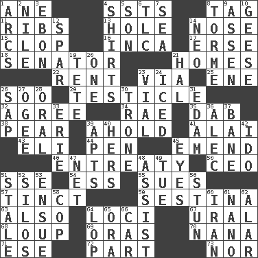 ACROSS 1. A saturated hydrocarbon 4. Fast planes 8. Label 11. Chest bones 13. Hollow 14. Olfactory organ 15. Hoof sound 16. South American Indian 17. Celtic language 18. Legislator 21. Dwellings 22. Monthly bill 23. By way of 25. Compass dir. 26. "Barney Miller" actor Jack 29. One of the two male reproductive glands 32. Match 34. Actress Charlotte 35. Pat or tap gently 38. Lightbulb-shaped fruit 39. Hold, grip (Informal) 41. Jai ____ 43. Biblical high priest 44. Animal enclosure 45. Make improvements or corrections to 46. Plea 50. Corporate head (abbr.) 51. Compass dir. 54. Curvy letter 55. Takes to court 57. Colored lightly or faintly 59. French poetic form 63. In addition 64. Locales 67. Mountain range 68. Central Nebraska county 69. Mouths or openings 70. Grandmother 71. Compass dir. 72. Piece 73. Not either DOWN 1. Curves 2. The longest river in the world 3. Inky black, to poets 4. Upper-body garments 5. Male offspring 6. Affectionate concern, for short 7. Ocean 8. Singer Mel 9. NE Netherlands city 10. Honkers 12. Coast Guard woman 14. Modern: prefix 19. Wig 20. Single 21. Actor Linden 23. Small bottle 24. On the rocks 26. Plant excrement 27. Double curve, resembling the letter S 28. Taken by mouth 30. Heavy duty weighing machine 31. Dutch treat 33. One of the Great Lakes 36. Actor Baldwin 37. Object of repulsion 39. Flats, for short 40. Possessive pronoun 42. Wedding promise 45. Sight organs 47. Remaining after all deductions 48. Help 49. Third day of the wk. 51. Lacking originality or spontaneity 52. Grain storage towers 53. Follow as a consequence or result 56. Make senseless or dizzy 58. Police officer (slang) 60. SW Asia republic 61. Billionth: prefix 62. Having or resembling wings 64. Chop off 65. Mouth or opening 66. Automobile