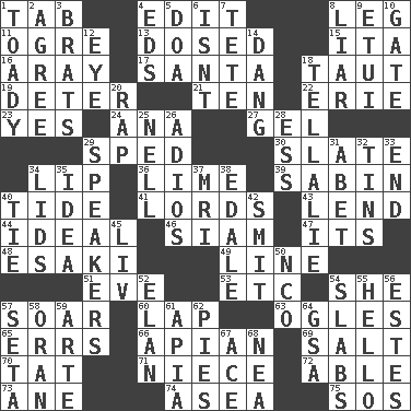 ACROSS 1. Keyboard key 4. Prepare for publication 8. Part of a journey 11. Legendary monster 13. Administered medicine 15. Call ___ day 16. Like ___ of sunshine 17. Before Barbara or Clara 18. Pulled tight 19. Prevent from occurring 21. "___ Little Indians" 22. One of the Great Lakes 23. It is so 24. Santa ___, CA 27. Set 29. Broke a traffic law 30. Schedule 34. Mouth edge 36. Citrus frut 39. Unit of acoustic absorption 40. Periodic rise and fall of the sea level 41. Nobles 43. Grant temporary use of 44. Perfect 46. Thailand, formerly 47. It is 48. 1973 Nobel Price Winner (Physics) Leo 49. Actor's bit 51. First lady 53. And so on (abbr.) 54. A female animal or person 57. Fly high 60. Pet locale 63. Stares at amorously 65. Blunders 66. Bee-related 69. Table seasoning 70. Make lace 71. Sibling's daughter 72. Competent 73. A saturated hydrocarbon 74. At sea 75. Mayday DOWN 1. Sycophant 2. Match 3. Naughty children 4. Begley and Asner 5. ___ good deed 6. Is not 7. Wig 8. One who doesn't tell the truth 9. Needle case 10. Yard entry 12. Sight organ 14. Mild oath, euphamism for damn 18. Copy Pinocchio 20. Hit sharply and swiftly 25. 1994 drama film starring Jodie Foster 26. Goodbye (Sp.) 28. Double-curved letter 29. Orators 31. Collude with 32. Airtight sealed metal containers 33. Conclude 34. Hats (slang) 35. It may be bright or harebrained 37. Medical imaging device (abbr.) 38. Peak District village in England 40. Standoff 42. Stricken, poetically 45. 54 in ancient Rome 50. Non-commissioned officer (abbr.) 52. Style 54. Thick slices 55. Phone greeting 56. _____ Park, CO 57. Bristle 58. NW Algerian seaport 59. Johnson of "Laugh-In" 61. Capital of Western Samoa 62. Sliced desserts 64. Girls' org. (abbr.) 67. Adept person 68. Teachers' org.