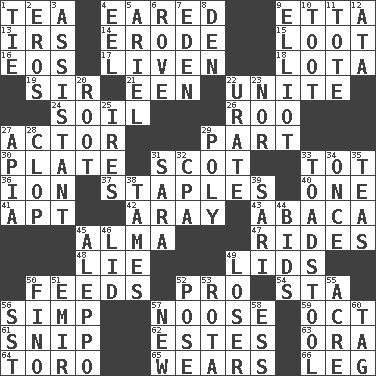 ACROSS 1. Beverage made from leaves 4. Having ears or earlike features 9. Singer James 13. Big collection agency 14. Wear away 15. Plunder 16. Greek goddess of the dawn 17. Make or become more lively 18. Globular water bottle used in Asia 19. Title for a knight 21. Car or cant ending 22. Join together 24. Land 26. Friend of Pooh 27. Thespian 29. Role in a play 30. Food holder 31. Highlander 33. Small child 36. Electrically charged atom 37. Paper fasteners 40. Single 41. Fitting 42. Like ___ of sunshine 43. Phillipine bananalike plant 45. _ mater 47. Amusement-park features 48. Falsehood 49. Flaplike coverings 50. Eats 52. Adept person 54. R.R. building 56. Simple or foolish person 57. Trap for birds or small mammals 59. Sep. follower 61. Clip 62. _____ Park, CO 63. Mouth or opening 64. "Corrida" creature 65. Erodes 66. Part of a journey DOWN 1. Make a knot 2. Greek god of love 3. Helper 4. Snakelike fish 5. Satellite of Uranus 6. Be footloose 7. Paradise 8. Lair 9. American author Paul (1891-1958) 10. A blast of a horn 11. Carry 12. _ moment's notice (2 wds.) 20. Carrot, for example 22. A salt of uric acid 23. Not either 25. Angers 27. Capital of Western Samoa 28. Hoof sound 29. More than one (prefix) 31. "Two Mules for Sister ____" 32. Accounting whiz (abbr.) 33. Inedible or poisonous agaric 34. At one time in the past 35. Afternoon social gatherings 38. Domesticates 39. Indian skirt 44. Auction offers 45. City in Syria 46. Flaplike covering 49. Failure 50. Fine (Spanish) 51. Arab leader 52. Airs 53. Round or rotation of duties 55. 43,560 square feet 56. Fast jet (abbr.) 57. ___ Haven, CT 58. Double-curved letter 60. Label