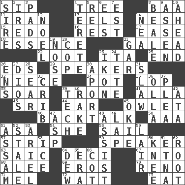 ACROSS 1. Small drink 4. Relationship diagram 8. Sound made by sheep 11. SW Asia republic 13. Snakelike fish 14. Tender 15. Redecorate 16. State of inaction 17. Relaxation 18. Center 21. An organ shaped like a helmet 22. Plunder 23. Call ___ day 25. Conclusion 26. Begley and Asner 29. Orators 32. Sibling's daughter 34. Cooking vessel 35. Trim (branches) 38. Fly high 39. Heavy duty weighing machine 41. Silent film actress Nazimova 43. _ Lanka 44. Hearing organ 45. A small or young owl 46. Sass 50. Auto club (abbr.) 51. White ___ sheet 54. A female animal or person 55. Move on water 57. Empty completely 59. Orator 63. Ketch in the Levant 64. Tenth: prefix 67. To the inside or interior of 68. Toward shelter 69. Greek god of love 70. Former U.S. Attorney General Janet 71. Cartoonist voice _ Blanc 72. Electrical Unit 73. Ingest DOWN 1. Beget 2. Angers 3. Groovy apts. 4. Cylindrical with tapered ends 5. Portuguese money of account (variant) 6. Raised railways 7. Eastern Standard Time (abbr.) 8. Calif. Air Force Base 9. NE Netherlands city 10. Toward the future 12. Christmas carol 14. Teachers' org. 19. Characteristic smell of wine 20. Police officer (slang) 21. Slender fish 23. Image 24. False hair 26. Followers of ems 27. "Vaya con ____" 28. Wither 30. To the left, to Queeg 31. Cole _ (cabbage dish) 33. Baby bed with high sides 36. Rounded earthenware pot or jar 37. Entreaty 39. Technology 40. Libertine 42. "One Day ___ Time" 45. Migrant worker of the '30s 47. Viper 48. Help 49. Infant locale 51. Indian state 52. Lacking originality or spontaneity 53. Satellite of Uranus 56. Den 58. Frozen water 60. Leg joint 61. Inactive volcano in Sicily 62. Carrot, for example 64. Morning condensation 65. Epoch 66. Small bed