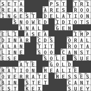 ACROSS 1. Stalk of a moss capsule 5. Pacific Standard Time (abbr.) 8. Three (prefix) 11. Bring up, as a child 12. Ancient Greek god of war 13. Friend of Pooh 14. Eat 17. Accusation by an informer 19. Frozen precipiation fell 21. Foolish or stupid persons 22. Of or related to the anus 23. Commissioned mil. rank 24. Connecticut Ivy Leaguer 27. Toward the sea 29. Naughty child 32. Middle Eastern gold or silver currency 34. Music discs 36. Taken by mouth 37. ____ Jay Lerner 38. Teat (slang) 39. Roll call or roster of names 40. Actor's bit 41. "Barney Miller" actor Jack 42. 2nd pers. sing. pres. of can (arch.) 43. Compass dir. 44. Not divided or shared with others 46. Institute legal proceedings 47. Had dinner 50. Aureate 52. Food allowance for one day 55. Ear of corn 57. Make much ado about nothing 59. Makes clutter 62. Storage container 63. Proofreading order 64. Patter 65. Eastern Standard Time (abbr.) 66. A weed 67. Chop _ DOWN 1. _ Lanka 2. Car or cant ending 3. Labels 4. Sports stadium 5. Before (prefix) 6. Former Milwaukee Brewers owner Bud 7. Sadhe (variant) 8. Musical group of three 9. Carrot, for example 10. Charged atoms 12. Increase 15. Echolocation 16. It was, poetically 18. Metal container 20. Chooses 24. Peak District village in England 25. Ms. Damita and namesakes 26. Lacking in sense or substance 28. Goodbye (Sp.) 29. Removes the wrinkles 30. Taiwanese island in East China Sea 31. Food holder 33. A saturated hydrocarbon 35. Moe Howard, for one 36. Mouth or opening 42. Cell (Danish) 45. Rich soil 47. Wind 48. Cod relative 49. Related on the mother's side 51. Flat circles 52. Loose flowing garment 53. Opinion 54. Portable shelter 55. Was introduced to 56. Son of Isaac 58. John Ritter's dad 60. Compass dir. 61. Filthy place