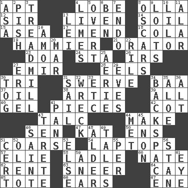 ACROSS 1. Fitting 4. Ear part 8. Water jar 12. Title for a knight 13. Make or become more lively 14. Land 15. At sea 17. Make improvements or corrections to 18. Root beer relative 19. More given to overacting 21. Speaker 23. ___ good deed 24. R.R. building 26. Big collection agency 27. Independent ruler or chieftain 28. Snakelike fish 30. Three (prefix) 31. Turn aside suddenly 34. Sound made by sheep 37. Lubricate 38. Nick name for Arthur 39. 100% 40. Set 41. Components 42. Small bed 43. Baby powder 44. Create 46. Elected rep. 47. Krazy ___ of comics 50. Followers of ems 51. Rough 54. Portable computers 57. Writer Wiesel 58. Dipping utensil 60. Nathan's nickname 62. Monthly bill 63. Scornful expression 64. Island 65. Carryall 66. Hearing organs 67. Compass dir. DOWN 1. White ___ sheet 2. Expression of disdain 3. Excercise machine 4. Citrus fruits 5. Unconcealed 6. Benjamin's nick name 7. Inside; within (prefix) 8. Motion picture awards 9. Plunders 10. _ and Stitch 11. Having or resembling wings 13. Luau accessory 16. Mine, in Marseilles 20. Impair 22. Cause heat under the collar 25. Nest on high 27. 4th largest of the Great Lakes 29. Nights before holidays 30. Coat; cloak 31. Travel by water 32. Raze 33. And so on (abbr.) 34. Keyboard key 35. _ vera 36. Keyboard modifier key 41. Zero-star reviews 43. Cylindrical with tapered ends 44. Was introduced to 45. Soon (poet.) 46. Inhabitant of Heaven 48. Tree or shrub in the Birch family 49. Falsehoods 51. Foregone conclusion 52. Butter sub 53. Otherwise 55. For each 56. Comedian Laurel of Laurel & Hardy 59. Santa ___, CA 61. Sight organ