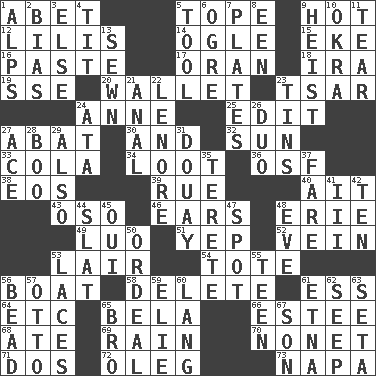 ACROSS 1. Collude with 5. Drink excessively 9. Being at a high temperature 12. Ms. Damita and namesakes 14. Stare at amorously 15. Make supply last 16. Thick mixture 17. Northwest Algerian city 18. Retirement account (abbr.) 19. Compass dir. 20. Place for singles 23. Russian ruler of old 24. Queen of England 1702-14 25. Prepare for publication 27. Blind as ____ 30. Also 32. Player for Phoenix 33. Root beer relative 34. Spoils 36. Order of Saint Francis (abbr.) 38. Greek goddess of the dawn 39. Sorrow 40. Small island 43. Bear (Spanish) 46. Hearing organs 48. 4th largest of the Great Lakes 49. Nilotic language 51. Slangy assent 52. Distinctive style or manner 53. Den 54. Lug 56. Water vessel 58. Keyboard key 61. Double-curved letter 64. And so on (abbr.) 65. Actor Lugosi 66. First name in cosmetics 68. Had dinner 69. Precipitation 70. Music written for nine 71. Two (Sp.) 72. Cassini of fashion 73. California wine valley DOWN 1. High mountains 2. Prejudice 3. Otherwise 4. Teat (slang) 5. Utensil 6. Legendary monster 7. Food holders 8. Car or cant ending 9. Robbery 10. Gumbo ingredient 11. Pull into pieces 13. Stitched 21. Of or related to the anus 22. Poe poem 23. Metal containers 24. _ moment's notice (2 wds.) 26. Superhero pair 27. Adept person 28. Oct. 31 cry 29. In addition 31. A city in N France, SE of Calais 35. Cigar-shaped 37. Conductor's collection 41. One more than two 42. "___ Little Indians" 44. Narrow board 45. Fr. "Yes" 47. Specific locale 48. First lady 50. Severe or trying experience 53. Shoestrings 55. Adolescent 56. Necklace unit 57. "Beetle Bailey" pooch 59. Writer Wiesel 60. Austrian-born American filmmaker Fritz 61. Inactive volcano in Sicily 62. Ooze 63. Bristle 65. Sis' sibling 67. Male child