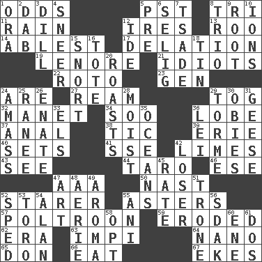 ACROSS 1. Likelihood 5. Pacific Standard Time (abbr.) 8. Three (prefix) 11. Water falling in drops from the sky 12. Angers 13. Friend of Pooh 14. Most capable 17. Conveyance 19. Poe poem 21. Foolish or stupid persons 22. Printing process, for short 23. Commissioned military rank (abbr.) 24. "We ___ not amused" (Victoria) 27. 480, 500 or 516 sheets of paper 29. Coat; cloak 32. French painter Edouard 34. "Barney Miller" actor Jack 36. Ear part 37. Of or related to the anus 38. Nervous spasm 39. One of the Great Lakes 40. Arranges properly for use 41. Compass dir. 42. Citrus fruits 43. Perceive with the eye 44. Pacific island yam 46. Compass dir. 47. Auto club (abbr.) 50. Political cartoonist Thomas 52. A viewer who gazes fixedly 55. Michaelmas daisies 57. Characterized by complete cowardliness 59. Eaten away 62. Period 63. Body of Kaffir warriors 64. Billionth: prefix 65. Spanish title 66. Erode 67. Supplements with great effort DOWN 1. Mouth or opening 2. Small moist lump or mass 3. Deli pickle 4. Scornful expression 5. Before (prefix) 6. Major League Baseball Commissioner Bud 7. Sadhe (variant) 8. Musical group of three 9. Carrot, for example 10. Charged particles 12. Binary compound 15. Derisive sound 16. Carryall 18. Shallow baking pan 20. Exposes to great heat 24. Collect or gather 25. The wife of a rajah (variant) 26. Maternal 28. Damp 29. Singer Mel 30. Off-Broadway awards 31. Honkers 33. Raised railways 35. Seas 36. Flowery wreath 42. Failure 45. Pace 47. Nonscientific branch of learning 48. Nest on high 49. Odor 51. Marketplace scale 52. Drove too fast 53. "Corrida" creature 54. Actor Alda or Thicke 55. Cuckoo 56. Neighbor of Neb. 58. Elect 60. Compass dir. 61. Two (Sp.)