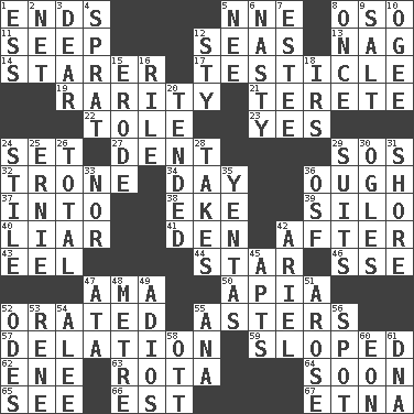 ACROSS 1. Extremities 5. Compass dir. 8. Bear (Spanish) 11. Ooze 12. Oceans 13. Tired old horse 14. A viewer who gazes fixedly 17. A testis 19. Noteworthy scarcity 21. Cylindrical with tapered ends 22. Lacquered or enameled metalware 23. It is so 24. Arrange properly for use 27. Gouge 29. Distress signal 32. Heavy duty weighing machine 34. 24 hours 36. Ending for "Through" and "Enough" 37. To the inside or interior of 38. Supplement with great effort 39. Grain storage tower 40. One who doesn't tell the truth 41. Lair 42. Following 43. Snakelike fish 44. Play the lead 46. Compass dir. 47. Housemaid (var.) 50. Capital of Western Samoa 52. Declaimed 55. Michaelmas daisies 57. Accusation by an informer 59. Had an oblique or slanted direction 62. Compass dir. 63. Roll call or roster of names 64. Within a short period 65. Observe 66. Eastern Standard Time (abbr.) 67. Inactive volcano in Sicily DOWN 1. Double-curved letter 2. Fish or hair follower 3. Letter starter 4. Small fatty European fish 5. Born 6. Offensive 7. First name in cosmetics 8. At one time in the past 9. Table seasoning 10. Double curve, resembling the letter S 12. Filthy place 15. Eat (away) 16. Cause heat under the collar 18. Big collection agency 20. Watched over 24. Vertical member of a panel or frame 25. Bert's buddy 26. "_____ Recall" 28. Proceeds 29. Costumes for special activities 30. Stares at amorously 31. Dinah or Pauly 33. And not 35. Gossips 36. Order of Saint Francis (abbr.) 42. Satellite of Uranus 45. Flats, for short 47. _ moment's notice (2 wds.) 48. Distance measurement (Brit.) 49. Goodbye (Sp.) 51. Came up 52. Lyric poems 53. French philosopher Descartes 54. Toward shelter 55. Santa ___, CA 56. Specific locale 58. Baseball player Mel 60. Period of immesurable duration 61. Heredity factor (abbr.)