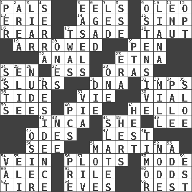 ACROSS 1. Friends 5. Snakelike fish 9. Butter sub 13. One of the Great Lakes 14. Eons 15. Simple or foolish person 16. Stern 17. Sadhe (variant) 18. Pulled tight 19. Moved like an arrow 21. Animal enclosure 22. Of or related to the anus 23. Inactive volcano in Sicily 24. Elected rep. 27. Double-curved letter 28. Mouths or openings 29. Disparaging remarks 31. Heredity factor (abbr.) 32. Naughty children 36. Event that recurs at intervals 37. Compete 38. Small bottle 39. Observes 40. Sliced dessert 41. Phone greeting 42. South American Indian 44. A female animal or person 46. Area sheltered from the wind 47. Lyric poems 48. For fear that 50. Observe 51. Chrissie's court nemesis 54. Distinctive style or manner 56. Secret plans 58. Method 60. Actor Baldwin 61. Cause heat under the collar 62. Probability 63. Hoop that covers a wheel 64. Nights before holidays 65. Remainder DOWN 1. For each 2. Length times width 3. One who doesn't tell the truth 4. Father Junipero _ 5. Artist's stands 6. Mild oath 7. Directed 8. Compass dir. 9. Clearly or manifestly demonstrative 10. Climbing, woody, usually tropical vines 11. Australian flightless bird 12. Elect 17. It was, poetically 20. Washington bills 21. Parent Teacher Assoc. 23. Period 24. Fast planes 25. Writer Wiesel 26. Unadorned 28. Single 30. Home 31. Pass on 33. Place where flour is made 34. Light colored 35. _ gin 37. By way of 40. Personal Computers (abbr.) 41. Command 43. Born 44. Chalkboards 45. Possessive pronoun 47. Flexible twig of a willow tree 49. Southeast Indonesia island 51. Undercover agent 52. Connecting point 53. Does sums 54. Large container 55. Biblical high priest 56. Before (prefix) 57. 54 in ancient Rome 59. Eastern Standard Time (abbr.)