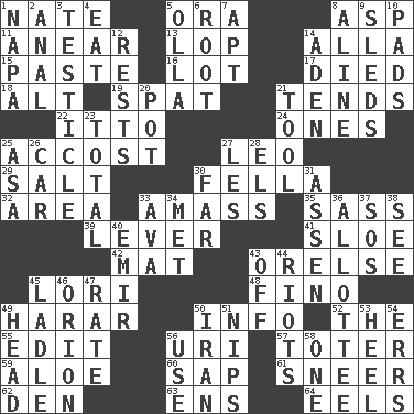ACROSS 1. Nathan's nickname 5. Mouth or opening 8. Viper 11. Approach 13. Trim (branches) 14. Silent film actress Nazimova 15. Thick mixture 16. Car dealer's back yard 17. Passed on 18. Keyboard modifier key 19. Petty quarrel 21. Looks after 22. "Tell ____ the Marines!" 24. Singles 25. Buttonhole 27. Lion 29. Table seasoning 30. Chap (slang) 32. Type of rug 33. Collect or gather 35. Backtalk 39. Crowbar 41. _ gin 42. Floor covering 43. Threatening words 45. Australian parrot (variant) 48. Fine (Spanish) 49. Ethiopian city, capital of Harari 50. A message received and understood 52. Definite Article 55. Prepare for publication 56. RI univ. 57. Carrier 59. _ vera 60. Plant excrement 61. Scornful expression 62. Lair 63. Followers of ems 64. Snakelike fish DOWN 1. California wine valley 2. Of or related to the anus 3. A testis 4. Erode 5. Spanish pot 6. Carrot, for example 7. Fitting 8. Place in a line 9. Bobsleighs 10. Writing tablets 12. Musical pauses 14. An important port of Yemen 20. Cooking vessel 21. Implement 23. "_____ Recall" 25. White ___ sheet 26. Automobile 27. French article 28. Raised railways 30. At a great distance 31. NE Netherlands city 33. Actress Gardner 34. Was introduced to 36. One to whom something is allotted 37. Mayday 38. Perceive with the eye 40. Independent ruler or chieftain 43. Not in operation 44. Disturbances 45. Dipping utensil 46. Greek mythologigal hunter 47. Pace 49. Froth on beer 50. SW Asia republic 51. Pinches, bites 53. The bottom of a shoe or boot 54. Blunders 56. Purpose 58. Single