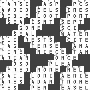 ACROSS 1. Tarsus (plural) 6. Viper 9. Personal Computers (abbr.) 12. Shun 13. Snakelike fish 14. Angers 15. The Good Book 16. Spoils 17. Sweet dark-red dessert wine 18. Ocean 19. Is not 20. Back-to-school mo. 21. Went 23. _-fi 24. Lick closed 25. Wetness 28. Connecticut Ivy Leaguer 30. Musical pauses 34. Quote 35. Label 36. Laconic 38. Santa ___, CA 39. Prong on a fork 41. Sibling's daughter 43. Scottish cap 44. Believer in; advocate of (suffix) 46. At one time in the past 48. Bear (Spanish) 49. Entreaty 50. Flintstone 51. Greater amount 53. Cartoonist voice _ Blanc 56. Move on water 57. Australian parrot (variant) 58. Nest on high 60. Ancient Greek god of war 61. First man 62. Heavy duty weighing machine 63. Affirmative reply 64. Writing instrument 65. Artist's stand DOWN 1. Keyboard key 2. Opinion 3. Loose flowing garment 4. Fodder prepared in a silo 5. Binary compound 6. Period of immesurable duration 7. Notch 8. Pacific Standard Time (abbr.) 9. Conciliate 10. Foregone conclusion 11. Fast jet (abbr.) 13. Otherwise 14. Medicinal drug used to evoke vomiting 19. An arm off of a larger body of water 20. Compass dir. 22. Boat paddle 24. Seigniories (variant) 26. Inactive volcano in Sicily 27. 480, 500 or 516 sheets of paper 28. Singer James 29. Den 31. Elected rep. 32. Three (prefix) 33. Compass dir. 37. Learning spot: Fr. 40. Artist's stands 42. Compass dir. 45. Lower and raise head in agreement 47. Device for capturing images 49. Demure 50. Conductor's collection 51. Method 52. Northwest Algerian city 54. Greek god of love 55. Actor's bit 56. Declare 57. Infant locale 58. Had dinner 59. Snakelike fish