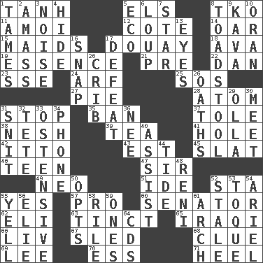 ACROSS 1. Hyperbolic tangent 5. Raised railways 8. Ring climax 11. Mine, in Marseilles 12. ____ d'Azur (French Riviera) 14. Boat paddle 15. Unmarried girls 17. A city in N France, SE of Calais 18. Actress Gardner 19. Substance 21. Before (prefix) 22. One of the 12 tribes of Israel 23. Compass dir. 24. Sandy's bark 25. Distress signal 27. Sliced dessert 28. Smallest unit of an element 31. Cease 35. Prohibit 37. Lacquered or enameled metalware 38. Tender 39. Afternoon social gathering 41. Hollow 42. "Tell ____ the Marines!" 43. Eastern Standard Time (abbr.) 45. Narrow board 46. Adolescent 47. Title for a knight 49. Modern: prefix 51. Binary compound 52. R.R. building 55. Consenting reply 57. Adept person 60. Elected representative 62. Connecticut Ivy Leaguer 63. A color or tint 65. Resident of Iraq 66. 54 in ancient Rome 67. Downhill vehicle 68. A slight indication 69. Area sheltered from the wind 70. Double-curved letter 71. The bottom of a shoe or boot DOWN 1. Domesticates 2. Collect or gather 3. Annoying sound 4. Flintstone garb 5. Environmental prefix 6. Central Nebraska county 7. Play the lead 8. Inedible or poisonous agaric 9. Polynesian shrub of the pepper family 10. Northwest Algerian city 13. Snake ____ (dice throw) 16. Fastener 17. Outscore 20. Baby bed with high sides 26. Expletives 29. Rounded earthenware pot or jar 30. Rendezvous 31. In a ____ (agitated or irritated) 32. Wig 33. Clearly or manifestly demonstrative 34. Give a jingle 36. Born 40. Help 44. Event that recurs at intervals 48. Painter Guido (1575-1642) 50. Chooses 52. Having lost freshness 53. Woman's close-fitting hat 54. Satellite of Uranus 55. Shout 56. Writer Wiesel 58. Cause heat under the collar 59. Washington bills 61. Bowlike part 64. Music discs