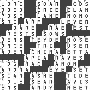 ACROSS 1. Australian parrot (variant) 5. Fly high 9. Music discs 12. Wrote a lyric poem 13. One of the Great Lakes 14. Style 15. Airs 16. Unable to walk 17. Words to Nanette 18. _ Lanka 19. Sandy's bark 21. Prying instrument 22. Have the gumption 24. Actress Charlotte 26. Eastern Standard Time (abbr.) 27. Musical pauses 28. Sty mamas 29. Lairs 30. Miss Universe 1986, Barbara Palacios _ 32. Sense of smell 36. Single time 37. Three (prefix) 38. One who uses or employs something 39. Arabian gulf 40. Large country 42. Singer James 43. Capital of Western Samoa 44. All-night dance parties 46. Coat; cloak 49. Apple computer (short form) 50. Soon (poet.) 51. Odor 53. Sight organ 54. Put into a specified state 57. Thailand, formerly 58. American tennis player Robert 61. Event that recurs at intervals 62. Lacquered or enameled metalware 63. Dry up 64. Advice 65. Followers of ems 66. Actor Griffith 67. Confront DOWN 1. Chops off 2. Aroma 3. Dwelling 4. Binary compound 5. Itself 6. Mouth or opening 7. Direct toward a target or goal 8. To separate or throw off 9. Garlic unit 10. Natives or inhabitants of Denmark 11. Derisive sound 14. Compass dir. 19. Nonscientific branch of learning 20. Repose 21. French article 23. NE Netherlands city 24. "The Thinker" sculptor 25. Deep reverence 27. Tear apart 28. Damascus' land 29. ___ good deed 31. Moral principle 32. New (sp.) 33. Clearly or manifestly demonstrative 34. Arranges properly for use 35. Epoch 40. Numbers guy (abbr.) 41. Like ___ of sunshine 43. Nanny (var.) 45. One (Scot) 46. Clothes sense 47. Greek mythologigal hunter 48. Purposes of endeavors 52. Madame (abbr.) 53. Suggestive of the supernatural 55. Singer Brickell 56. Trial 58. White ___ sheet 59. Elected rep. 60. Possessed 61. Scottish cap