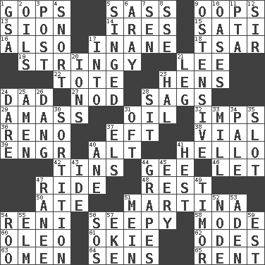 ACROSS 1. Republicans 5. Backtalk 9. I made a mistake 13. The Jewish people; Israel 14. Angers 15. Suttee (variant) 16. In addition 17. Empty; void 18. Russian ruler of old 19. Slender, wiry 21. Area sheltered from the wind 22. Haul 23. Coop moms 24. Male parent 27. Dreamland 28. Droops 29. Collect or gather 31. Lubricate 32. Naughty children 36. Western Nevada city 37. Lizard (obsolete) 38. Small bottle 39. Engineer (abbr.) 40. Keyboard modifier key 41. Phone greeting 42. Metal containers 44. Turn to the right 46. Allow 47. Travel on or in a vehicle 48. Relief 50. Had dinner 51. Chrissie's court nemesis 54. Painter Guido (1575-1642) 56. Not well drained, as in land 58. Method 60. Butter sub 61. Migrant worker of the '30s 62. Lyric poems 63. Sign of something about to happen 64. Elected reps. 65. Monthly bill DOWN 1. Girls' org. (abbr.) 2. Lubricates 3. Mail 4. Derisive sound 5. Burned superficially 6. Like ___ of sunshine 7. Elected rep. 8. Compass dir. 9. Clearly or manifestly demonstrative 10. Fertile tracts in a desert 11. Parent Teacher Assoc. 12. Title for a knight 17. To the inside or interior of 20. Charged particles 21. Part of a journey 23. Actor Linden 24. Have the gumption 25. So be it 26. Mild oath, euphamism for damn 28. Be seated 30. Casting lots 31. Often (poetically) 33. Place where flour is made 34. Diluted with white 35. Notch 37. Raised railways 40. One (Scot) 41. Command 43. Binary compound 44. Raisin fruits 45. Suggestive of the supernatural 47. The wife of a rajah (variant) 49. Southeast Indonesia island 51. Chow _ 52. Connecting point 53. Arabian gulf 54. Friend of Pooh 55. Shade tree 56. Mayday 57. Supplement with great effort 59. Eastern Standard Time (abbr.)