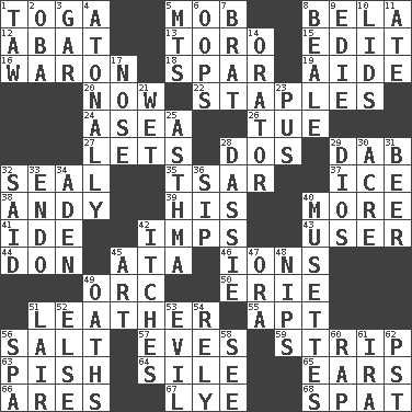 ACROSS 1. Ancient Roman robe 5. Disorderly crowd 8. Actor Lugosi 12. Blind as ____ 13. "Corrida" creature 15. Prepare for publication 16. Make _____ (do battle with) 18. Coast Guard woman 19. Helper 20. At this time 22. Paper fasteners 24. At sea 26. Third day of the wk. 27. Allows 28. Two (Sp.) 29. Pat or tap gently 32. Lick closed 35. Russian ruler of old 37. Frozen water 38. "60 Minutes" Commentator Rooney 39. Part of HMS, perhaps 40. Greater amount 41. Binary compound 42. Naughty children 43. One who uses or employs something 44. Spanish title 45. "One Day ___ Time" 46. Charged atoms 49. The grampus (Milton) 50. 4th largest of the Great Lakes 51. Cordwainer's material 55. Fitting 56. Table seasoning 57. Nights before holidays 59. Empty completely 63. Expression of disdain 64. Filth; sediment 65. Hearing organs 66. Ancient Greek god of war 67. Potassium hydroxide 68. Petty quarrel DOWN 1. The 23rd letter of the Hebrew alphabet 2. Chief or king in Benin or Nigeria 3. Slender fish 4. Lacking a tonal center or key 5. Mountains (abbr.) 6. I made a mistake 7. Naughty child 8. Memphis, Tenn. Street 9. Singer Brickell 10. Hats (slang) 11. Had dinner 14. Speaker 17. Characteristic smell of wine 21. Soggy 23. Fluid product of inflammation 25. Respiratory problem 28. Hyrax 29. "Vaya con ____" 30. Land measure 31. Fermented drink made from hops 32. Alleged 33. Inside; within (prefix) 34. Arabian gulf 36. Small drink 40. French bagpipes 42. Skin irritations 45. Nonscientific branch of learning 47. Mouth or opening 48. Pinches, bites 49. Profane or obscene expressions 51. Den 52. Otherwise 53. Tending to cause great harm 54. Have trust in 56. Health resort 58. Perceive with the eye 60. Hit sharply and swiftly 61. Lyricist Gershwin 62. Pacific Standard Time (abbr.)