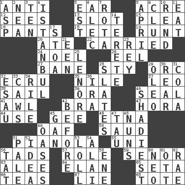 ACROSS 1. Opposed to 5. Hearing organ 8. 43,560 square feet 12. Observes 13. Slit 15. Entreaty 16. Leg coverings 18. False hair 19. Undersized animal 20. Had dinner 22. Borne 24. Christmas carol 26. Snakelike fish 27. Object of repulsion 28. Filthy place 29. The grampus (Milton) 32. Shade of tan 35. "Death on the ____" 37. Lion 38. Travel by water 39. Mouth or opening 40. Lick closed 41. Leather borer 42. Naughty child 43. Israeli folk dance 44. Purpose 45. Unit of force equal to gravity 46. Inactive volcano in Sicily 49. Clumsy lout 50. Saudi Arabian king (1953-1964) 51. Player piano 55. University (slang) 56. Small boys 57. Hero or heavy, e.g. 59. Sir (Sp.) 63. Toward shelter 64. Flair 65. Stalk of a moss capsule 66. Afternoon social gatherings 67. Falsehood 68. Carry DOWN 1. Viper 2. Teachers' org. 3. "___ Little Indians" 4. Byzantium, centuries later 5. Eastern Standard Time (abbr.) 6. Actor Baldwin 7. Round or rotation of duties 8. Showery time 9. A slight indication 10. Tear apart 11. Erode 14. Cigar-shaped 17. Portico 21. Car or cant ending 23. Marina Del _, California 25. Poe poem 28. Chalkboards 29. Margarine 30. Located in or toward the back 31. Root beer relative 32. He sold his birthright 33. Crow sounds 34. Cause heat under the collar 36. Lyricist Gershwin 40. Most dark, concealed or hidden 42. Prior to 45. Separate the seeds from cotton 47. The 19th letter of the Greek alphabet 48. Religious women 49. Fertile tracts in a desert 51. Light colored 52. The main thing one is thinking about 53. Hang loosely or laxly 54. Jai ____ 56. Make lace 58. Compass dir. 60. Modern: prefix 61. Baseball player Mel 62. Actress Charlotte